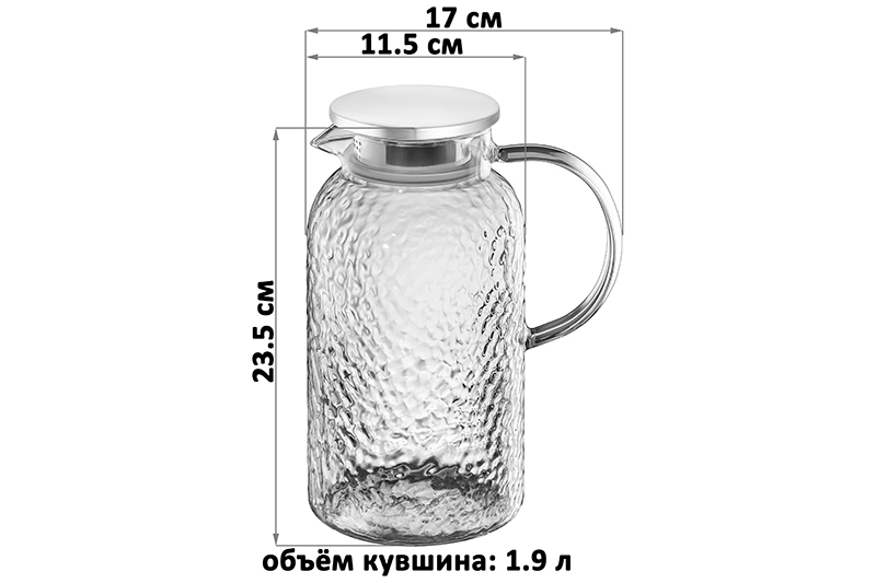Кувшин от Elan Gallery из серии Crystal glass 17х11,5х23,5 см на 1,9 литра выполнен из боросиликатного стекла, имеет рельефную поверхность. Высота без крышки – 22,5 см. На основании крышечки есть 2 варианта фильтра: один с мелкими отверстиями от попадания ягод и чаинок в кружку, второй в виде крупного отверстия (удобно для наливания воды). Расположите у носика ту сторону крышки, где находится нужный фильтр. Наполненный соком или чаем, он поможет организовать дружеские встречи и украсит ваш стол. Жаропрочное стекло выдерживает от -20 до +150 градусов и позволит заварить чай, а потом остужать в той же емкости. Не имеет в составе вредных веществ, не впитывает запахи. Подходит для холодных и горячих напитков. Прозрачный сосуд можно использовать как чайный заварник или молочник для хранения свежего молока. Стеклянный кувшин многофункциональный и жаростойкий: не понадобится отдельный чайник для заваривания. Можно приспособить как ёмкость под алкогольные напитки на празднике. Что может быть лучше холодного лимонада или компота из ягод в жару на даче! Используйте кувшин как лимонадницу и для эстетичной сервировки вина и коктейлей. Благодаря жаропрочному стеклу кувшин походит для сервировки горячего глинтвейна с фруктами. Наслаждайтесь тёплыми напитками зимой или дождливой осенью! Крышка выполнена из металла и имеет силиконовый уплотнитель. Она прочно сидит даже при наклоне и хорошо сохраняет тепло. Не рекомендуется применять абразивные моющие средства. Беречь от механических повреждений и резких перепадов температур. Без крышки лимонадник подходит для использования в микроволновой печи и посудомоечной машине. Поставляется в картонной коробке. Станет приятным подарком на любой праздник. В серии Crystal glass можно найти разнообразные кувшины и графины, которые подходят для горячей жидкости. Красивая посуда, кухонный инвентарь и товары для дома от бренда Элан Галерея позволят создать уют на вашей кухне или в столовой!
