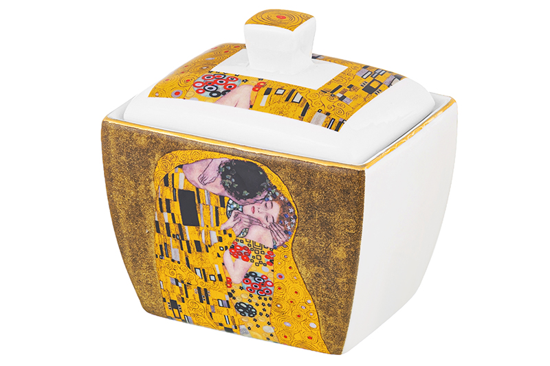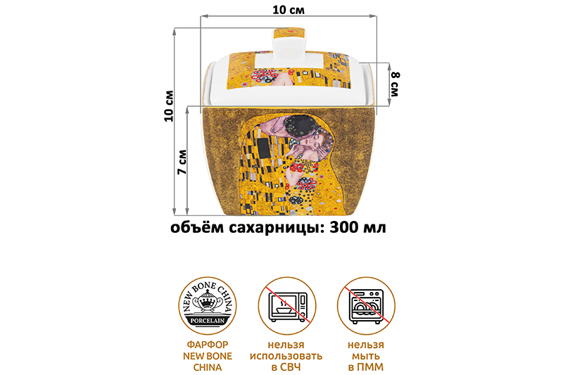 Сахарница серии "Поцелуй" объемом 300 мл поможет организовать множество приятных чаепитий. Сахарница украшена роскошными репродукциями картины Густава Климта "Поцелуй" и обрамлена золотым окаймлением. Выполнена из высококачественного фарфора New Bone China. Это фарфор нового поколения, не уступающий традиционному костяному по качеству, но при этом гораздо более экологичный в производстве. Размер изделия 10х8х10 см. Не подходит для использования в микроволновой печи и посудомоечной машине. Поставляется в подарочной упаковке. Сахарница из серии посуды "Поцелуй" сможет стать настоящим украшением кухни или приятным подарком для ваших родных и близких!