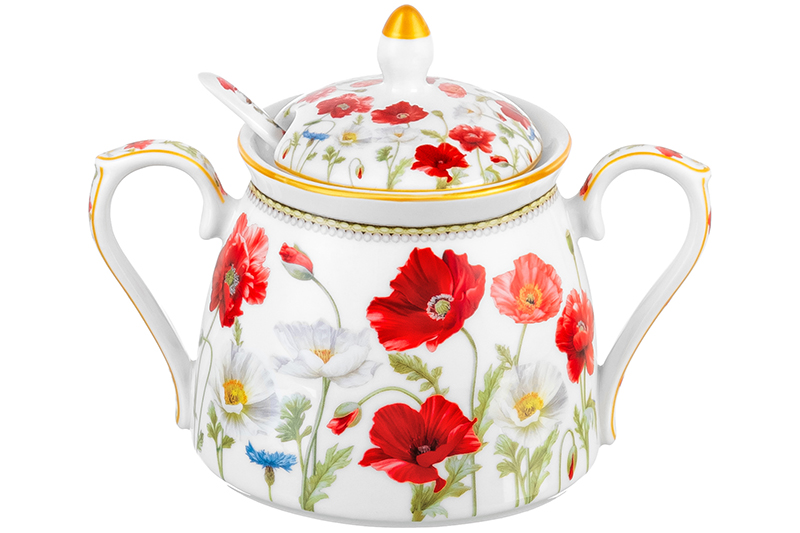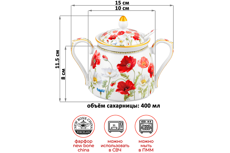 БЫЛО 796 руб! Сахарница 400 мл 15*10*11,5 см "Маки" с ложкой NEW BONE CHINA