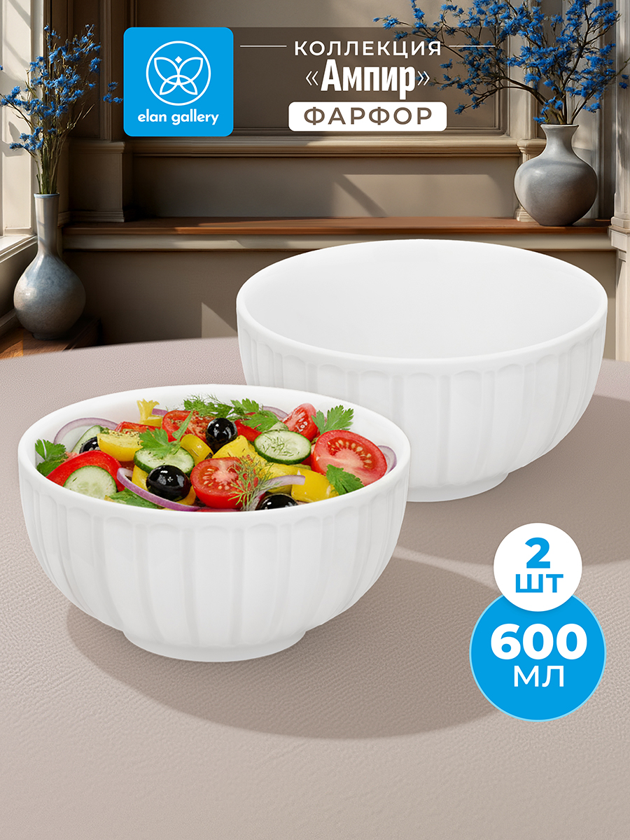 Набор 2 салатников из серии «Ампир» предназначен для эстетичной сервировки вашего стола. Размер каждой ёмкости – 13,5х13,5х7 см, объём – 600 мл. Выполнены из высококачественного белого фарфора. Он не впитывает цвет продуктов и легко отмывается, благодаря чему надолго сохраняет свою белизну. Поверхность изделий украшает элегантный ребристый рельеф. Круглые миски станут идеальным вариантом для любителей здорового питания. Используйте их для приготовления и подачи салатов, а также сервирования овощей и фруктов. Кроме того, они подойдут для холодных закусок и гарниров, разнообразных сладостей и десертов. Задействуйте ёмкости в качестве конфетниц для организации уютного чаепития. Не рекомендуется применять абразивные моющие средства. Подходят для использования в посудомоечной машине и микроволновой печи. Поставляются в дизайнерской картонной коробке – благодаря ей вам не потребуется дополнительная подарочная упаковка. Фарфоровая сервировочная посуда будет оригинальным подарком для хозяйки, ценящей не только практичность, но и привлекательность. Серия «Ампир» от бренда Элан Галерея станет украшением любого кухонного инвентаря и позволит собрать красивый сервиз в едином стиле!