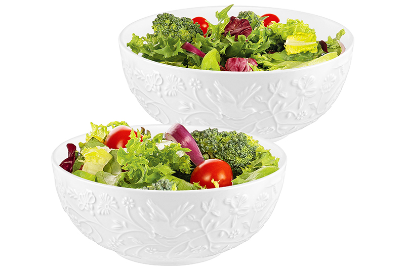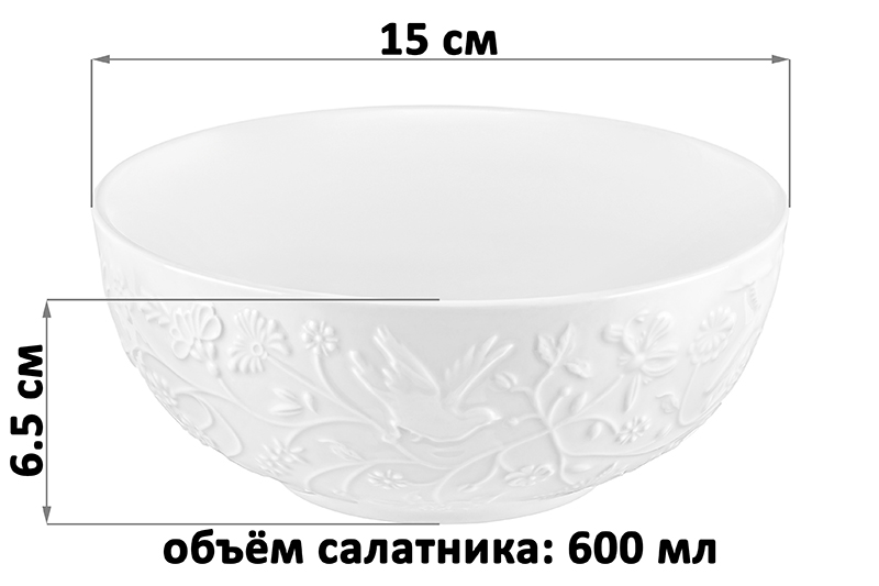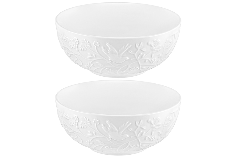 Набор 2 салатников из серии «Райский сад» от Elan Gallery предназначен для эстетичной сервировки вашего стола. Размер каждого изделия – 15х15х6,5 см, объём – 600 мл. Выполнены из высококачественного белого фарфора. Он не впитывает цвет продуктов и легко отмывается, благодаря чему надолго сохраняет свою белизну. Поверхность изделий овивают тонкие лиственные и цветочные веточки, возле которых порхают выразительные птицы. Большие глубокие миски станут идеальными вариантами для любителей здорового питания. Используйте для приготовления и подачи салатов, а также овощей и фруктов. Кроме того, они послужат для сервировки холодных закусок и гарниров, разнообразных сладостей и десертов. Задействуйте в качестве конфетниц для организации уютного чаепития. Мягкая округлая форма и изысканный дизайн позволят салатницам гармонично дополнить интерьер любой кухни или столовой. Не рекомендуется применять абразивные моющие средства. Подходят для использования в посудомоечной машине и микроволновой печи. Поставляются в дизайнерской картонной коробке – благодаря ей вам не потребуется дополнительная подарочная упаковка. Фарфоровая сервировочная посуда будет оригинальным подарком для хозяйки, ценящей не только практичность, но и привлекательность. Серия «Райский сад» от бренда Элан Галерея станет украшением любого кухонного инвентаря и позволит собрать красивый сервиз в едином стиле!