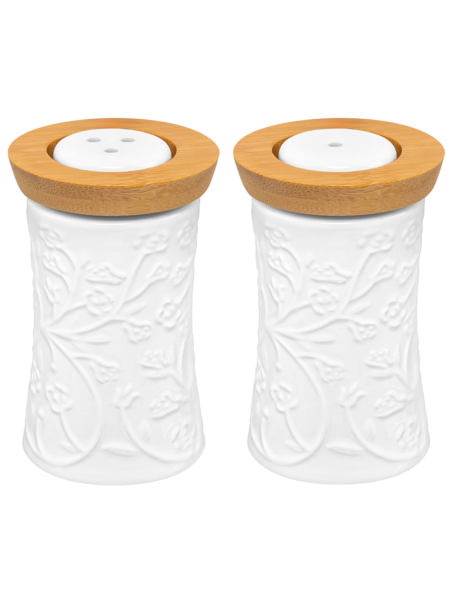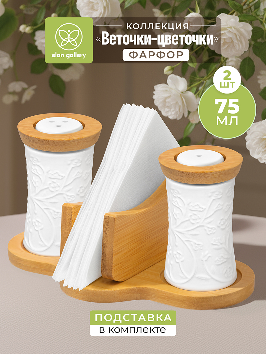 Набор для специй из серии «Веточки-цветочки» от Elan Gallery предназначен для эстетичной сервировки вашего стола. Общий размер комплекта – 18,3х11,5х9,5 см. Размер каждой ёмкости – 5,5х5,5х8,5 см, объём – 75 мл. Выполнены из высококачественного белого фарфора с декоративными элементами из бамбука. Поверхность изделия украшают рельефные узоры в виде лиственных веточек с аккуратными цветочными бутончиками. Подставка выполнена из натурального бамбука и оснащена салфетницей, её размер – 9,5х6х4 см. Ёмкости позволят держать под рукой все необходимые во время приготовления еды специи и приправы. Они отлично дополнят сервировку стола для сытного завтрака или уютного ужина. Подавайте их вместе с горячими блюдами, чтобы каждый мог приправить пищу по своему вкусу. Фарфоровые контейнеры наполняются через отверстия снизу и закрываются пластиковой пробкой. Салфетница послужит для компактного хранения салфеток и бумажных полотенец. Она станет не только функциональным, но и стильным дополнением вашего стола во время любого приёма пищи. Углубления в бамбуковой подставке обеспечат устойчивость набора. Не рекомендуется применять абразивные моющие средства. Комплект не подходит для использования в посудомоечной машине и микроволновой печи. Поставляется в дизайнерской картонной коробке – благодаря ей вам не потребуется дополнительная подарочная упаковка. Фарфоровая сервировочная посуда будет оригинальным подарком для хозяйки, ценящей не только практичность, но и привлекательность. Серия «Веточки-цветочки» от бренда Элан Галерея станет украшением любого кухонного инвентаря и позволит собрать красивый сервиз в едином стиле!