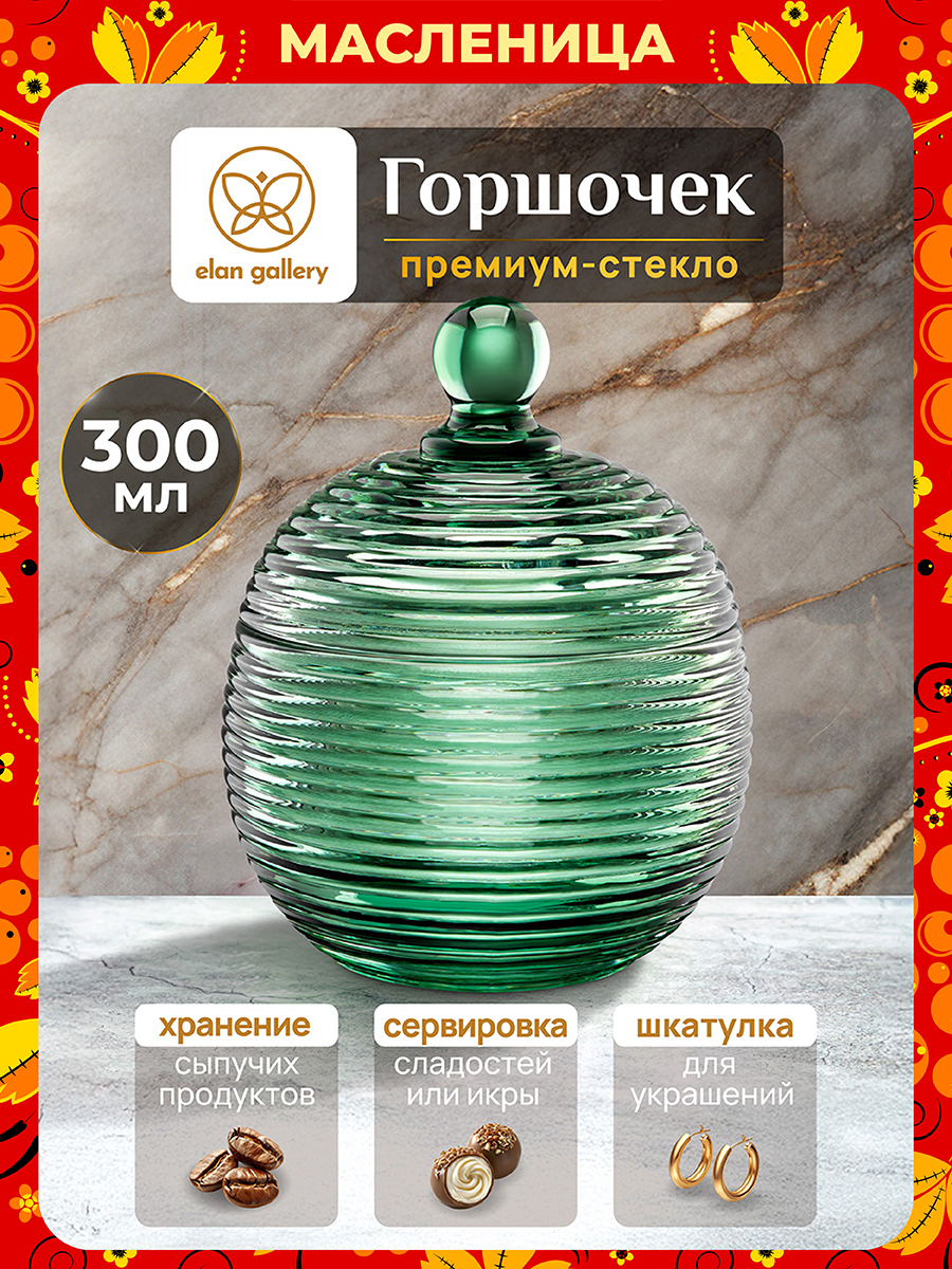 Горшочек для мёда Elan Gallery "Каскад" с крышкой выполнен из стекла и украшен декоративным рельефным узором в виде горизонтальных полосок. Размер изделия – 10,7х10,7х13,5 см, объём – 300 мл. Высота без крышки – 7 см. Баночка зелёного цвета с полосатым рельефом подойдёт для хранения мёда, варенья, сахара и соли. Поможет отпраздновать Широкую Масленицу со вкусом! Масленица – это чудесный повод собраться за праздничным столом и насладиться тёплой атмосферой и традиционной русской кухней. В ассортименте бренда Elan Gallery вы найдёте предметы декора и красивую посуду для приготовления и сервировки масленичных блюд. Пусть Масленичная неделя принесет вам радость и множество вкусных моментов! Можно использовать её как ёмкость для чая, кофе и других сыпучих продуктов. Декоративная баночка круглой формы станет гармоничным дополнением при сервировке вашего стола как в будни, так и на праздник. Красивый дизайн позволит использовать её не только для хранения продуктов, но и для подачи на стол. Положите в неё конфеты или икру, чтобы удивить гостей изящной сервировкой. Стеклянную ёмкость с крышечкой можно использовать не только как сахарницу, икорницу или соусник, но и для специй и приправ. Это позволит держать под рукой всё необходимое во время приготовления и приёма пищи. На даче медовница будет незаменимой для семейного чаепития, а также подойдёт для подачи ягод. В качестве альтернативы красивую вазочку с крышкой можно использовать как шкатулку или органайзер. Сложите в неё украшения и любые маленькие предметы. Подходит в роли стакана для свечи. Не рекомендуется применять абразивные моющие средства. Нельзя использовать в микроволновой печи и посудомоечной машине. Поставляется в стильной картонной упаковке. Красивая посуда – это отличный подарок на любой праздник. Медовый бочонок "Каскад" станет многофункциональным дополнением вашего кухонного инвентаря и украсит домашний интерьер!