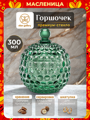 Горшочек для мёда Elan Gallery "Пузырьки" с крышкой выполнен из стекла и украшен декоративным рельефным узором. Размер изделия – 11х11х13,5 см, объём – 300 мл. Высота без крышки – 7 см. Интересная баночка зелёного цвета подойдёт для хранения мёда, варенья, сахара и соли. Можно использовать её как ёмкость для чая, кофе и других сыпучих продуктов. Поможет отпраздновать Широкую Масленицу со вкусом! Масленица – это чудесный повод собраться за праздничным столом и насладиться тёплой атмосферой и традиционной русской кухней. В ассортименте бренда Elan Gallery вы найдёте предметы декора и красивую посуду для приготовления и сервировки масленичных блюд. Пусть Масленичная неделя принесет вам радость и множество вкусных моментов! Декоративная баночка круглой формы станет гармоничным дополнением при сервировке вашего стола как в будни, так и на праздник. Красивый дизайн позволит использовать её не только для хранения продуктов, но и для подачи на стол. Положите в неё конфеты или икру, чтобы удивить гостей изящной сервировкой. Стеклянную ёмкость с крышечкой можно использовать не только как сахарницу, икорницу или соусник, но и для специй и приправ. Это позволит держать под рукой всё необходимое во время приготовления и приёма пищи. На даче медовница будет незаменимой для семейного чаепития, а также подойдёт для подачи ягод. В качестве альтернативы красивую вазочку с крышкой можно использовать как шкатулку или органайзер. Сложите в неё украшения и любые маленькие предметы. Подходит в роли стакана для свечи. Не рекомендуется применять абразивные моющие средства. Нельзя использовать в посудомоечной машине и микроволновой печи. Поставляется в стильной картонной упаковке. Красивая посуда – это отличный подарок на любой праздник. Медовый бочонок "Пузырьки" станет многофункциональным дополнением вашего кухонного инвентаря и украсит домашний интерьер!