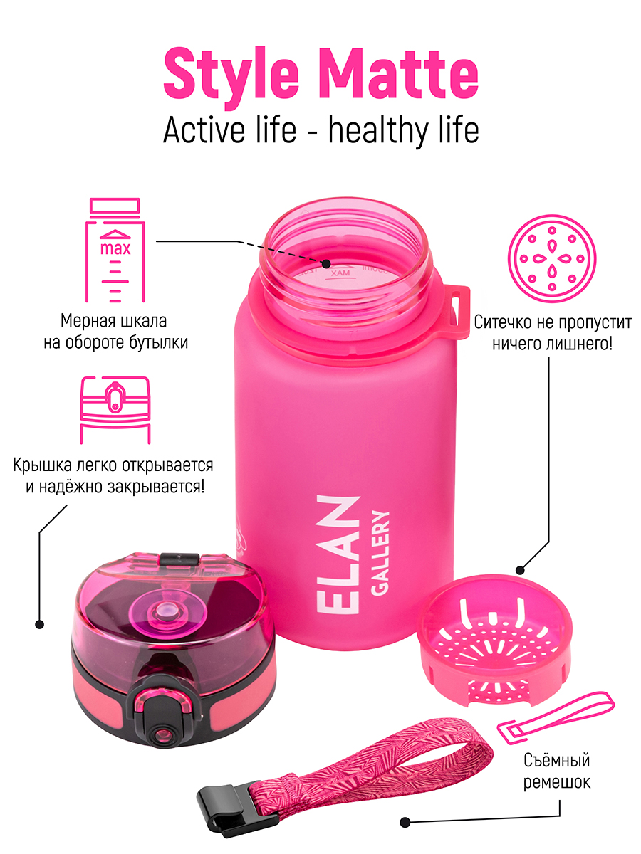 Бутылка для воды «Style Matte» от Elan Gallery – это практичное и стильное решение для ценителей активного образа жизни. Размер ёмкости – 6,8х6,8х17 см. Высота до крышки – 12,5 см. Объём – 350 мл. Изделие выполнено из тритана – прочного, безопасного материала, не содержащего бисфенол А. Этот пластик не впитывает запахи и не влияет на вкус напитков. Бутылочка подходит как для холодной, так и для горячей жидкости. Освежитесь любимыми летними напитками в жару или согрейтесь ароматным чаем зимой! Матовое покрытие обеспечивает комфортное использование на прогулке, в офисе и на тренировке в зале. Надёжная крышка с герметичным клапаном препятствует проливанию, а встроенное ситечко позволит заваривать напитки с травами и фруктами. С удобным ремешком бутылку можно закрепить на рюкзаке или запястье – это позволяет брать её в путешествия, поездку на велосипеде или автомобиле. Многоразовая дорожная бутылка подходит как для туризма, так и для пикника на природе. Удобная форма делает её не только туристическим, но и спортивным инвентарём. Пластиковая ёмкость для питья – прекрасный вариант для занятий фитнесом, йогой или бегом в спортзале или на свежем воздухе. Она также дополнит занятия велоспортом в качестве велосипедного аксессуара. Это надёжный помощник спортсменам во время игры в футбол или волейбол, занятий гимнастикой и танцами. Подходит как для взрослых, так и для школьников – её можно взять в школу и на занятия физкультурой. Благодаря универсальному дизайну и цвету фуксия она подойдёт как девочкам, так и мальчикам в качестве школьного аксессуара. Функциональная бутылка в дизайнерской картонной упаковке – это готовый подарок для женщин и мужчин. Не подходит для микроволновой печи, посудомоечной машины и стерилизатора. В коллекции бренда Элан Галерея представлена разнообразная посуда и товары для дома на любой вкус. Спортивные аксессуары из серии «Style Matte» помогут следить за водным балансом, где бы вы ни находились!