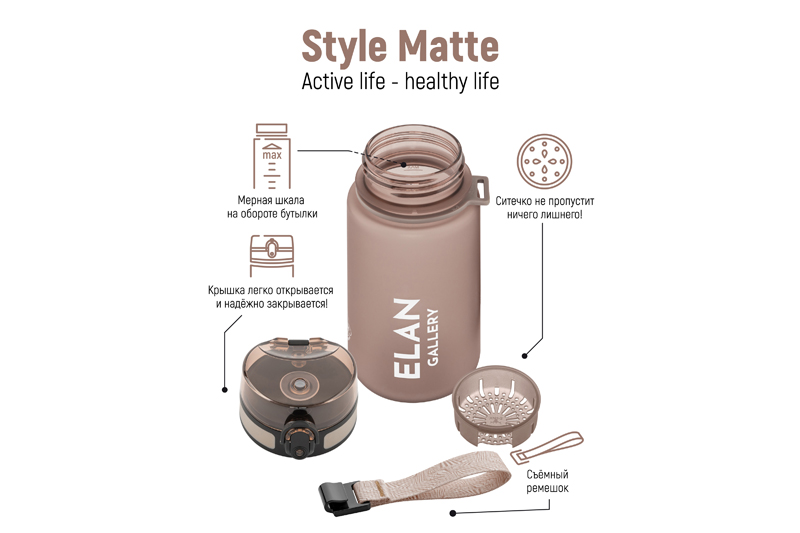 Бутылка для воды «Style Matte» от Elan Gallery – это практичное и стильное решение для ценителей активного образа жизни. Размер ёмкости – 6,8х6,8х17 см. Высота до крышки – 12,5 см. Объём – 350 мл. Изделие выполнено из тритана – прочного, безопасного материала, не содержащего бисфенол А. Этот пластик не впитывает запахи и не влияет на вкус напитков. Бутылочка подходит как для холодной, так и для горячей жидкости. Освежитесь любимыми летними напитками в жару или согрейтесь ароматным чаем зимой! Матовое покрытие обеспечивает комфортное использование на прогулке, в офисе и на тренировке в зале. Надёжная крышка с герметичным клапаном препятствует проливанию, а встроенное ситечко позволит заваривать напитки с травами и фруктами. С удобным ремешком бутылку можно закрепить на рюкзаке или запястье – это позволяет брать её в путешествия, поездку на велосипеде или автомобиле. Многоразовая дорожная бутылка подходит как для туризма, так и для пикника на природе. Удобная форма делает её не только туристическим, но и спортивным инвентарём. Пластиковая ёмкость для питья – прекрасный вариант для занятий фитнесом, йогой или бегом в спортзале или на свежем воздухе. Она также дополнит занятия велоспортом в качестве велосипедного аксессуара. Это надёжный помощник спортсменам во время игры в футбол или волейбол, занятий гимнастикой и танцами. Подходит как для взрослых, так и для школьников – её можно взять в школу и на занятия физкультурой. Благодаря универсальному дизайну и цвету капучино она подойдёт как девочкам, так и мальчикам в качестве школьного аксессуара. Функциональная бутылка в дизайнерской картонной упаковке – это готовый подарок для женщин и мужчин. Не подходит для микроволновой печи, посудомоечной машины и стерилизатора. В коллекции бренда Элан Галерея представлена разнообразная посуда и товары для дома на любой вкус. Спортивные аксессуары из серии «Style Matte» помогут следить за водным балансом, где бы вы ни находились!