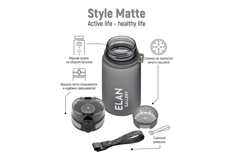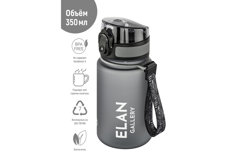 Бутылка для воды «Style Matte» от Elan Gallery – это практичное и стильное решение для ценителей активного образа жизни. Размер ёмкости – 6,8х6,8х17 см. Высота до крышки – 12,5 см. Объём – 350 мл. Изделие выполнено из тритана – прочного, безопасного материала, не содержащего бисфенол А. Этот пластик не впитывает запахи и не влияет на вкус напитков. Бутылочка подходит как для холодной, так и для горячей жидкости. Освежитесь любимыми летними напитками в жару или согрейтесь ароматным чаем зимой! Матовое покрытие обеспечивает комфортное использование на прогулке, в офисе и на тренировке в зале. Надёжная крышка с герметичным клапаном препятствует проливанию, а встроенное ситечко позволит заваривать напитки с травами и фруктами. С удобным ремешком бутылку можно закрепить на рюкзаке или запястье – это позволяет брать её в путешествия, поездку на велосипеде или автомобиле. Многоразовая дорожная бутылка подходит как для туризма, так и для пикника на природе. Удобная форма делает её не только туристическим, но и спортивным инвентарём. Пластиковая ёмкость для питья – прекрасный вариант для занятий фитнесом, йогой или бегом в спортзале или на свежем воздухе. Она также дополнит занятия велоспортом в качестве велосипедного аксессуара. Это надёжный помощник спортсменам во время игры в футбол или волейбол, занятий гимнастикой и танцами. Подходит как для взрослых, так и для школьников – её можно взять в школу и на занятия физкультурой. Благодаря универсальному дизайну и серому цвету она подойдёт как девочкам, так и мальчикам в качестве школьного аксессуара. Функциональная бутылка в дизайнерской картонной упаковке – это готовый подарок для женщин и мужчин. Не подходит для микроволновой печи, посудомоечной машины и стерилизатора. В коллекции бренда Элан Галерея представлена разнообразная посуда и товары для дома на любой вкус. Спортивные аксессуары из серии «Style Matte» помогут следить за водным балансом, где бы вы ни находились!