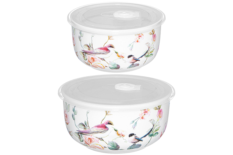 Набор 2 салатников из серии «Певчие птички» от Elan Gallery предназначен для эстетичной сервировки вашего стола. Включает в себя изделия разных размеров: 16х16х8 см (объём – 1 литр, размер без крышки – 15х15х7,5 см) и 13,5х13,5х7 см (объём – 500 мл, размер без крышки – 12,5х12,5х6,5 см). Выполнены из фарфора нового поколения new bone china, сочетающего в себе изящность и высокую прочность. Такие изделия легко отмываются, поэтому сохраняют привлекательный вид и практичны в использовании. От других видов костяного фарфора new bone china отличается большей экологичностью в производстве. Изделия украшены рисунком пёстрых птичек и пышных бутонов роз. Они выполнены в манере, вдохновлённой акварельным рисунком. Крышки выполнены из пластика и оснащены силиконовыми уплотнителями. Большие глубокие миски станут идеальным вариантом для любителей здорового питания. Используйте их для приготовления и подачи салатов, а также для сервирования овощей и фруктов. Кроме того, они подойдут для холодных закусок и гарниров, разнообразных сладостей и десертов. Задействуйте в качестве конфетниц для организации уютного чаепития. Герметичные крышки надёжно защитят продукты от попадания грязи и пыли и позволят хранить готовые блюда в холодильнике. Благодаря нежному дизайну изделия впишутся в интерьер любой кухни, гостиной или столовой. Не рекомендуется применять абразивные моющие средства. Можно мыть в посудомоечной машине. С открытым клапаном на крышке можно использовать в микроволновой печи. Без крышки можно использовать в духовом шкафу при температуре до 230 градусов. Поставляются в дизайнерской картонной коробке – благодаря ей вам не потребуется дополнительная подарочная упаковка. Фарфоровая сервировочная посуда будет оригинальным подарком для хозяйки, ценящей не только практичность, но и привлекательность. Серия «Певчие птички» от бренда Элан Галерея подарит вам ощущение мечтательной лёгкости!