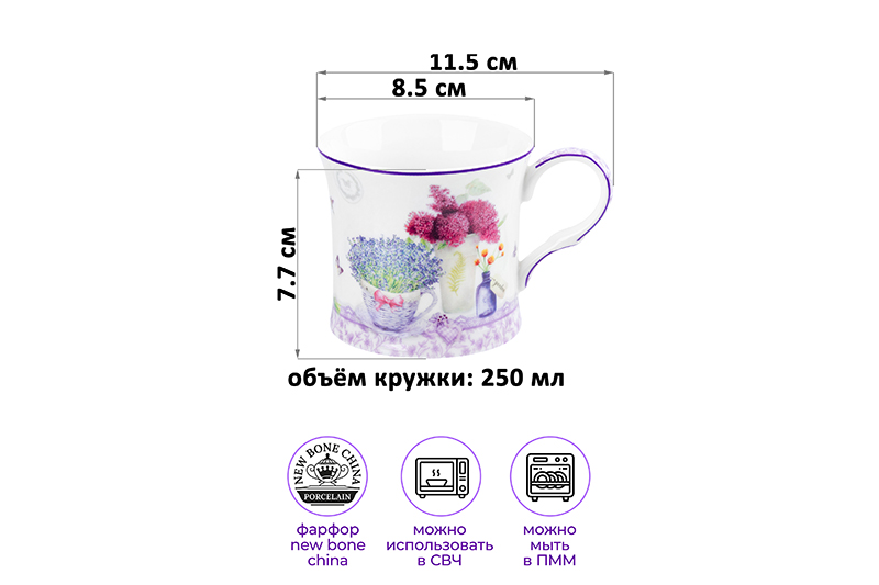 Набор 2 кружек Elan Gallery "Лаванда" выполнен из фарфора нового поколения new bone china. Размер каждой кружки 11,5х8,5х7,7 см, объём 250 мл. New bone china сочетает в себе изящность и высокую прочность. От других видов костяного фарфора материал отличается большей экологичностью в производстве. Серия "Лаванда" украшена нежным принтом на тему Прованса – французской провинции, которая славится своими лавандовыми полями и красивыми пейзажами. Изображение пышных букетов лаванды и гортензии позволит окунуться в атмосферу тепла, гармонии и южного солнца, не покидая вашей кухни или столовой! В коллекции вы найдёте любые принадлежности для эстетичной сервировки. Каждая кружечка подходит ценителям чая и кофе, которые любят пить из красивой и необычной посуды. Это отличный вариант для того, чтобы согреться горячим какао зимой и освежиться прохладным лимонадом летом. Интересный бокал с удобной ручкой украсит ваш стол своим стильным дизайном как на праздник, так и в будни. Пейте молоко или кефир и наслаждайтесь красивой картинкой! В офисе станет незаменимым предметом для чаепития или перерыва на капучино и латте. Белая посуда из фарфора с рисунком в фиолетовых и сиреневых тонах станет украшением интерьера вашей кухни и добавит ему нотки тепла и гармонии. В отличие от керамики она не впитывает цвет и запах напитка, легко отмывается и сохраняет свой привлекательный вид долгие годы. Не рекомендуется применять абразивные моющие средства. Можно использовать в микроволновой печи и мыть в посудомоечной машине. Поставляется в красочной картонной коробке. Фарфоровая посуда с цветочками станет приятным подарком на любой праздник. Благодаря стильной коробочке вам не понадобится дополнительная подарочная упаковка! Наслаждайтесь любимыми напитками из этих кружечек сами, либо сделайте сюрприз своим близким! Серия "Лаванда" позволит собрать чайный или кофейный сервиз в едином стиле и станет украшением вашего дома.