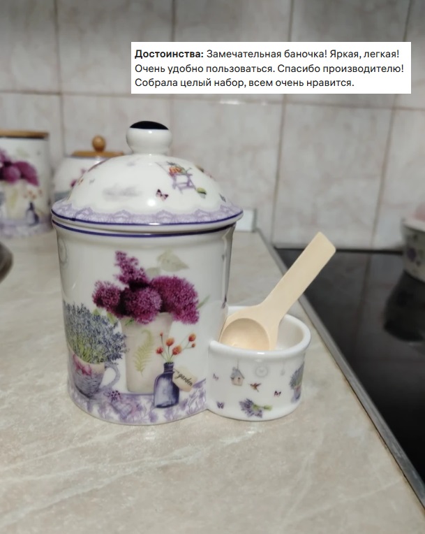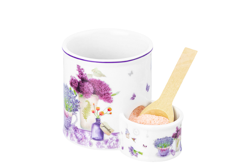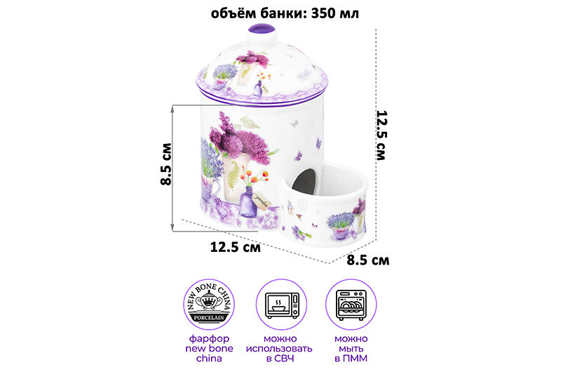 БЫЛО 911 руб! Банка д/соли 350 мл 12,5*8,5*12,5 см "Лаванда" с крышкой, с деревянной ложкой NEW BONE CHINA