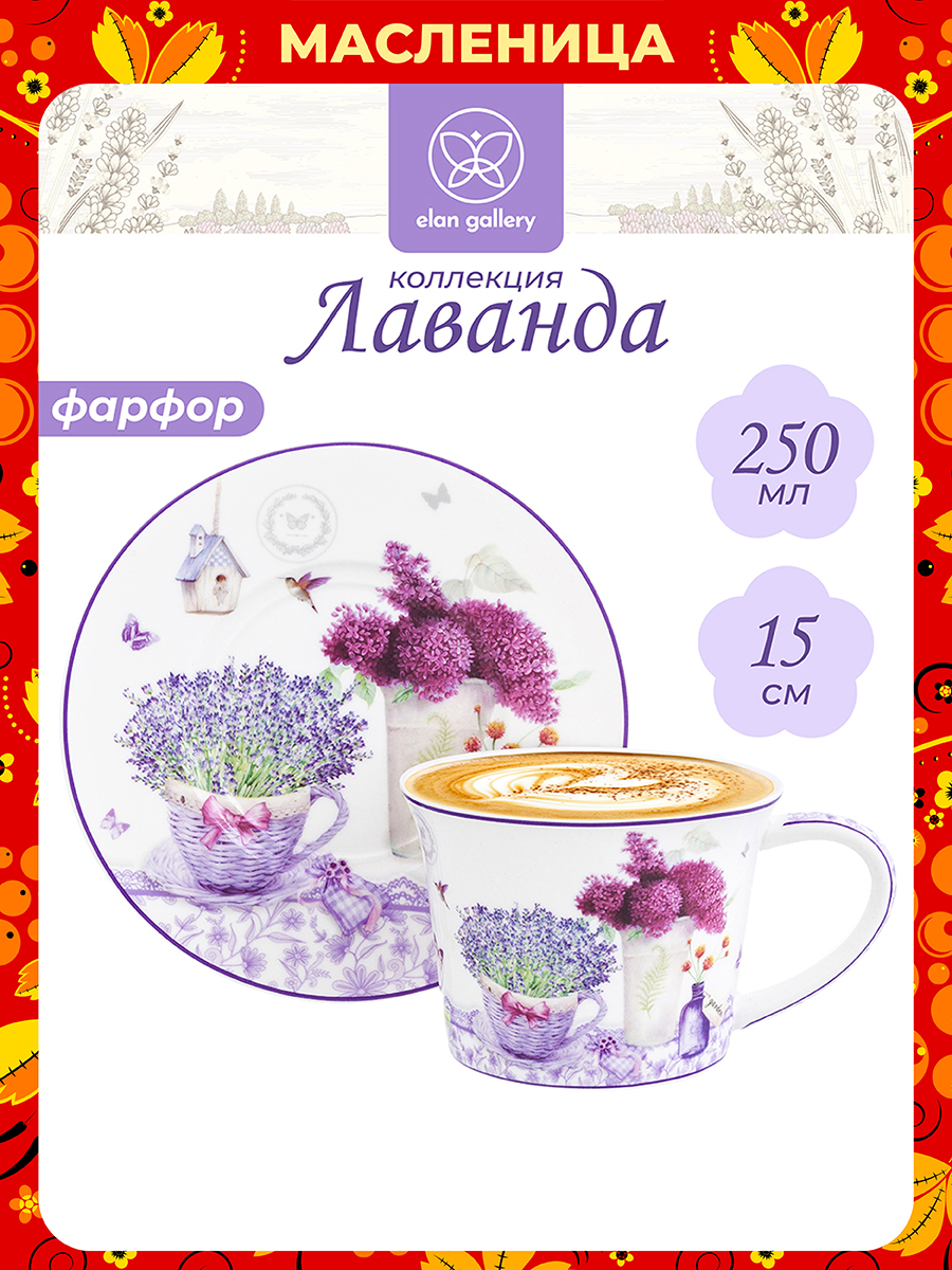 Чайная пара Elan Gallery "Лаванда" выполнена из фарфора нового поколения new bone china. New bone china сочетает в себе изящность и высокую прочность. От классического костяного фарфора материал отличается большей экологичностью в производстве. Объём чашки – 250 мл, размер 12,5х9,5х7 см. Размер блюдца – 15х15х2 см. Чашка и блюдечко круглой формы имеют фиолетовую кайму. Помогут отпраздновать Широкую Масленицу со вкусом! Масленица – это чудесный повод собраться за праздничным столом и насладиться тёплой атмосферой и традиционной русской кухней. В ассортименте бренда Elan Gallery вы найдёте предметы декора и красивую посуду для приготовления и сервировки масленичных блюд. Пусть Масленичная неделя принесет вам радость и множество вкусных моментов! Серия "Лаванда" украшена нежным принтом на тему Прованса – французской провинции, которая славится своими лавандовыми полями и красивыми пейзажами. Изображение пышных букетов лаванды и гортензии позволит окунуться в атмосферу тепла, гармонии и южного солнца, не покидая вашей кухни или столовой! Кружка с блюдцем подходят ценителям чая и кофе, которые любят пить из красивой посуды. Чашка украсит ваш стол своим стильным дизайном как на праздник, так и в будни. Это идеальный вариант для того, чтобы согреться горячим чаем зимой и освежиться прохладным лимонадом летом. Используйте блюдце как подставку под чашку, чтобы порадовать гостей изящной сервировкой. Положите на блюдце кусочек торта, домашнего пирога или пирожное. Небольшая тарелочка подойдёт не только для десерта, но и закусок: сырной нарезки, колбасы или свежих овощей. Не рекомендуется применять абразивные моющие средства. Набор можно использовать в микроволновой печи и посудомоечной машине. Поставляется в красивой картонной коробке. Станет приятным подарком вашим близким на любой праздник. Благодаря стильной коробочке не понадобится подарочная упаковка. Чашка с десертным блюдцем станут украшением вашей кухни или приятным сюрпризом для близких!