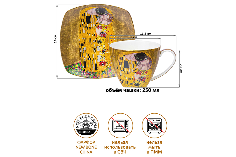 Чайная пара из серии «Поцелуй» от Elan Gallery предназначена для эстетичной сервировки вашего стола. Размер ёмкости – 11,5х9х7,5 см, объём – 250 мл. Размер блюдца – 14х14х1 см. Выполнены из фарфора нового поколения new bone china, сочетающего в себе изящность и высокую прочность. За счёт гладкости изделия легко отмываются, поэтому сохраняют привлекательный внешний вид и практичны в использовании. Плотная структура материала позволяет посуде сохранять температуру блюд и напитков. От других видов костяного фарфора new bone china отличается большей экологичностью в производстве. Изделия украшены роскошной репродукцией картины художника Густава Климта. В коллекции можно найти много красивой посуды и предметов декора с изображениями по мотивам шедевров мировой живописи! Кофейная кружка поможет провести множество приятных завтраков с капучино и латте, а также уютные чайные вечера с конфетами, вафлями, другими десертами и сладостями. Подойдёт ценителям чая и кофе, которые любят пить из красивой и необычной посуды. Согрейтесь зимой любимым напитком: какао с маршмэллоу, ягодным чаем или горячим шоколадом. Летом освежитесь домашним лимонадом или морсом. Используйте сервировочное блюдце как подставку для чашки, порадовав гостей изящной сервировкой. Положите на десертную тарелку пирожное, кусочек торта или домашнего пирога. Подойдёт не только для десертов, но и для закусок: сырной нарезки, сырокопчёной колбасы или свежих овощей и зелени. Не рекомендуется применять абразивные моющие средства. Не использовать в посудомоечной машине и микроволновой печи. Поставляются в дизайнерской картонной коробке – благодаря ей вам не потребуется дополнительная подарочная упаковка. Фарфоровая сервировочная посуда послужит оригинальным подарком для хозяйки, ценящей не только практичность, но и привлекательность. Серия «Поцелуй» от бренда Элан Галерея станет украшением любого кухонного инвентаря и позволит собрать сервиз в едином стиле!