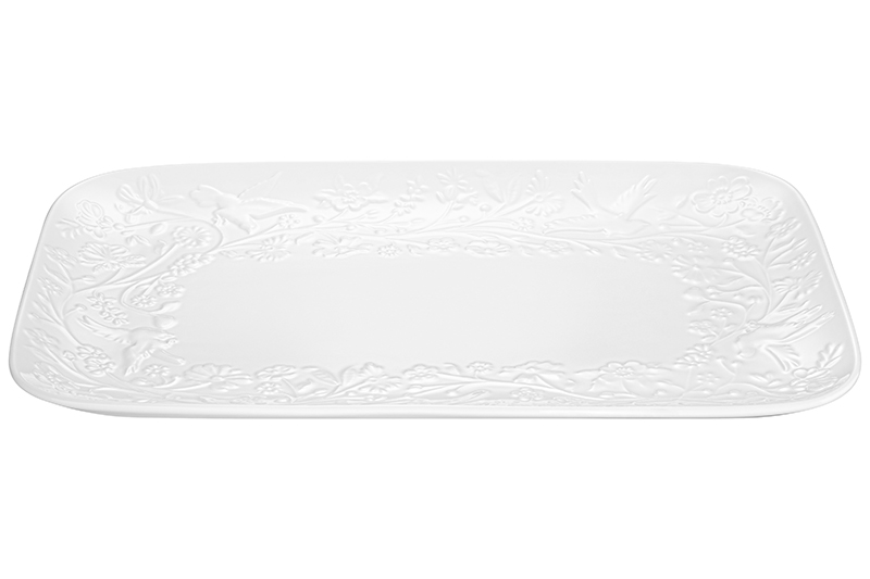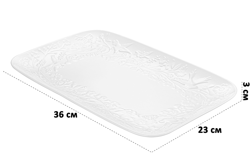 Прямоугольное блюдо из серии «Райский сад» от Elan Gallery предназначено для эстетичной сервировки вашего стола. Размер изделия – 36х23х3 см. Поможет отпраздновать Широкую Масленицу со вкусом! Масленица – это чудесный повод собраться за праздничным столом и насладиться тёплой атмосферой и традиционной русской кухней. В ассортименте бренда Elan Gallery вы найдёте предметы декора и красивую посуду для приготовления и сервировки масленичных блюд. Пусть Масленичная неделя принесет вам радость и множество вкусных моментов! Выполнено из высококачественного белого фарфора. Он не впитывает цвет продуктов и легко отмывается, благодаря чему надолго сохраняет свою белизну. Поверхность изделия овивают тонкие лиственные и цветочные веточки, возле которых порхают выразительные птицы. Тарелка подойдёт для подачи рыбных и мясных блюд, а также разнообразных закусок. Благодаря её вместительности можно красиво подать целую курицу, рыбу и любое другое мясо. Используйте для сервирования салатов, сырной нарезки, овощей и фруктов, чтобы угостить большое количество гостей. На сервировочном блюде удобно разместить кусочки торта или пирога, конфеты, зефир, а также другие десерты и сладости. Подойдёт для красивой подачи суши, роллов или бутербродов на завтрак. Благодаря лаконичному дизайну изделие впишется в интерьер любой кухни, столовой или гостиной. Не рекомендуется применять абразивные моющие средства. Подходит для использования в посудомоечной машине и микроволновой печи. Поставляется в дизайнерской картонной коробке – благодаря ей вам не потребуется дополнительная подарочная упаковка. Фарфоровая сервировочная посуда будет оригинальным подарком для хозяйки, ценящей не только практичность, но и привлекательность. Серия «Райский сад» от бренда Элан Галерея станет украшением любого кухонного инвентаря и позволит собрать красивый сервиз в едином стиле!