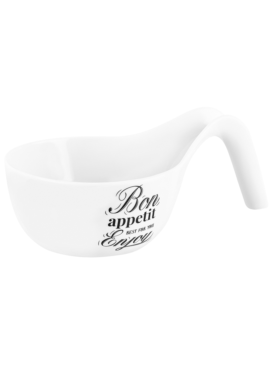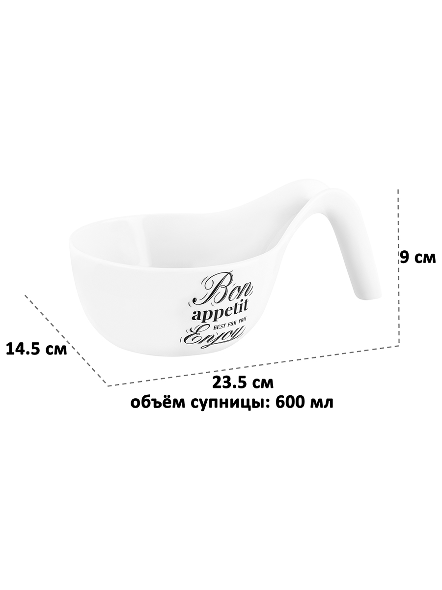 Салатник-супница от Elan Gallery «Bon Appetit» размером 23,5х14,5х9 см выполнен из белого фарфора. Имеет удобную ручку. Объём ёмкости – 600 мл. «Bon Appetit» – это коллекция фарфоровой посуды в стиле френч-винтаж, которая создаст на вашей кухне атмосферу романтики и уюта. Глубокая суповая тарелочка украшена лаконичными надписями чёрного цвета, стилизованными под ретро. Чёрно-белая обеденная посуда впишется в любой интерьер кухни или столовой, а также придаст элегантности вашему столу. Круглую тарелку можно использовать как супницу, салатник или сервировочное блюдо. Она станет незаменимым предметом для сервировки каши на завтрак, а в обед подойдёт для супа, бульона или окрошки. Благодаря глубокой форме блюдо станет незаменимым помощником для подачи плова или гарниров: лапши, гречки и риса с овощами. За счёт высоких стеночек удобно для смешивания ингредиентов. Возьмите его на дачу, чтобы приспособить как фарфоровую миску для ягод или вазочку для конфет. Используйте за просмотром любимых фильмов как мисочку под снеки и чипсы! В отличие от керамики фарфор не впитывает цвет и запах продуктов. Готовьте салаты из таких овощей, как свекла и морковь, фарфоровая поверхность чаши легко отмывается! Не рекомендуется применять абразивные моющие средства. Можно использовать в микроволновой печи и мыть в посудомоечной машине. Бульонница поставляется в стильной картонной коробке. Эта тарелка станет отличным подарком на праздник для тех, кто ценит стильную сервировку. Благодаря красочной коробочке вам не понадобится дополнительная подарочная упаковка. В коллекции бренда Elan Gallery представлено много товаров для дома и красивого кухонного инвентаря. Здесь можно найти сервировочные блюда и конфетницы на любой вкус!