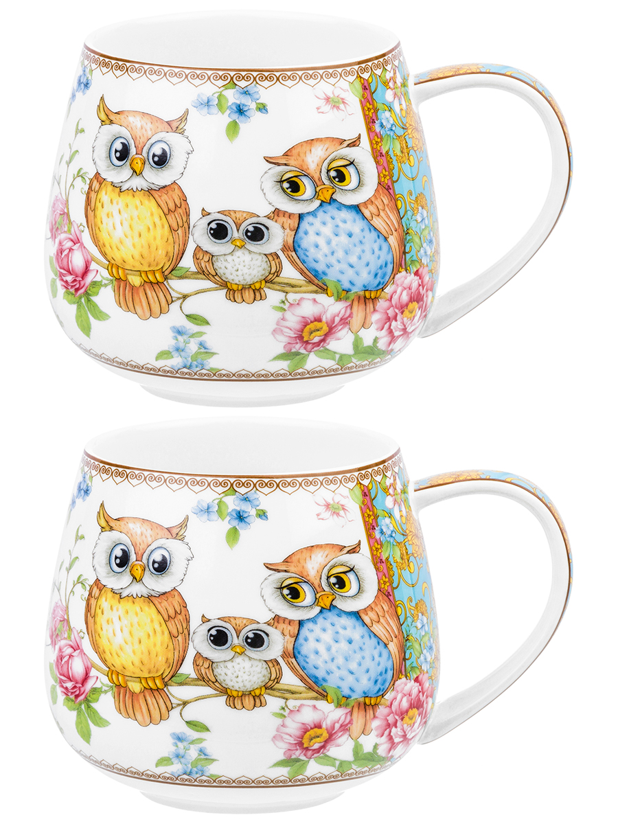 БЫЛО 941 руб! Набор 2 кружек 400 мл 13*10*8,5 см "Совушки" бочонок NEW BONE CHINA, фарфор