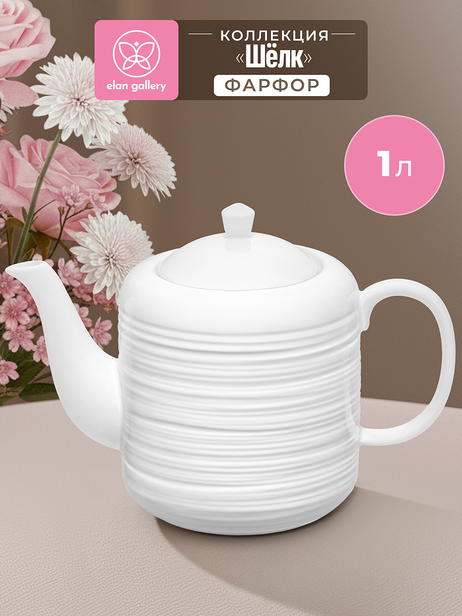 Заварочный чайник Elan Gallery "Шёлк" размером 22,5х12х16 см и объёмом 1 литр выполнен из белого фарфора. Высота без крышки – 12,5 см. Фарфоровый чайничек подходит для ежедневного заваривания чая и станет незаменимым предметом для праздничного чаепития. Вы сможете насладиться ароматным чаем и удивить гостей красивой сервировкой стола как в будни, так и на праздник. Чайник подойдёт для любых горячих напитков и удобен в использовании. Он оснащен фильтром в виде маленьких отверстий в стеночке, благодаря которому вы сможете наслаждаться ароматной заваркой без попадания мелких чаинок. На фарфоровой крышке с обратной стороны есть язычок, чтобы она хорошо держалась. Фарфоровое изделие станет украшением кухни и незаменимым помощником для организации чайных церемоний. Порадуйте гостей ароматным напитком и десертом с заварным кремом! Не рекомендуется применять абразивные моющие средства. Беречь от резких перепадов температур и механических повреждений. Можно использовать в посудомоечной машине и микроволновой печи. Поставляется в стильной картонной коробке. Вам не придётся искать дополнительную подарочную упаковку, чтобы сделать сюрприз близким на праздник. Праздничная посуда – хороший вариант для подарка. Красивый дизайн и функциональность подарочного чайника понравятся каждому, а высокое качество фарфора обеспечит его долговечность. В коллекции бренда Элан Галерея можно найти много красивого кухонного и столового инвентаря, а также собрать чайный набор на свой вкус. Коллекция "Шёлк" от Elan Gallery наполнит повседневные моменты лёгкостью и сказочной атмосферой, а также позволит создать красивую сервировку праздничного стола!