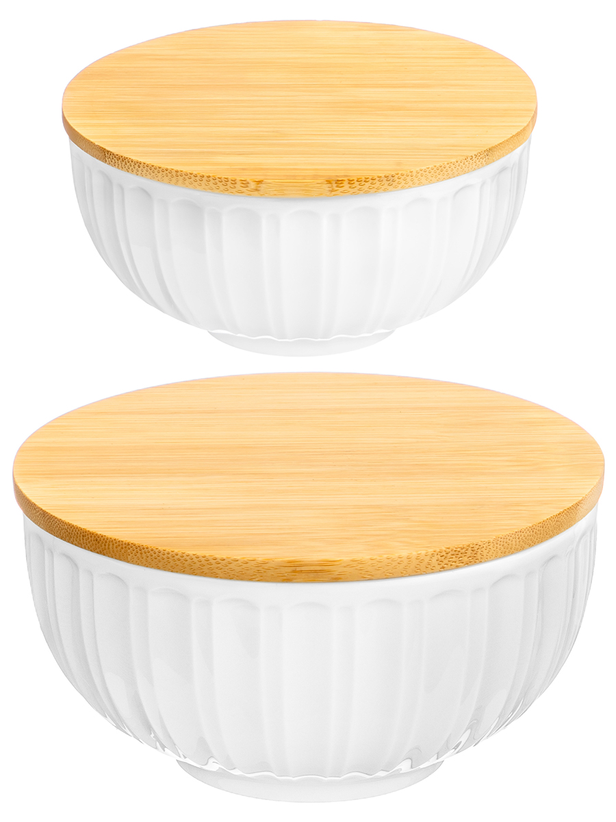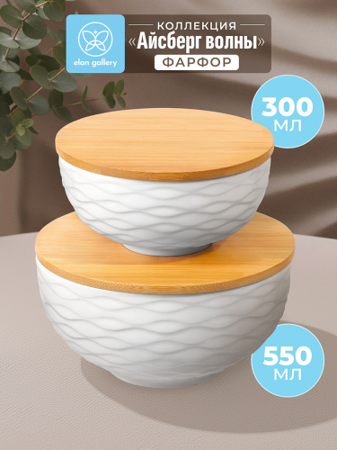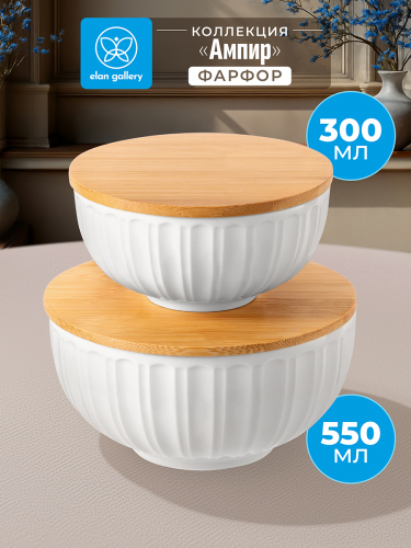 Набор 2 салатников из серии «Ампир» от Elan Gallery предназначен для эстетичной сервировки вашего стола. Включает изделия разных размеров: 11,5х11,5х6 см (объём – 300 мл) и 14х14х7,5 см (объём – 550 мл). Выполнены из высококачественного белого фарфора. Он не впитывает цвет продуктов и легко отмывается, благодаря чему надолго сохраняет свою белизну. Поверхность изделий украшает элегантный ребристый рельеф. Крышки выполнены из натурального бамбука и оснащены силиконовыми уплотнителями. Круглые миски станут идеальным вариантом для любителей здорового питания. Используйте их для приготовления и подачи салатов, а также сервирования овощей и фруктов. Кроме того, они подойдут для холодных закусок и гарниров, разнообразных сладостей и десертов. Задействуйте ёмкости в качестве конфетниц для организации уютного чаепития. Герметичные крышки позволят вам хранить готовые блюда в холодильнике. Не рекомендуется применять абразивные моющие средства. Без бамбуковых крышек подходят для использования в посудомоечной машине и микроволновой печи. Бамбук нельзя замачивать! Поставляются в дизайнерской картонной коробке – благодаря ей вам не потребуется дополнительная подарочная упаковка. Фарфоровая сервировочная посуда будет оригинальным подарком для хозяйки, ценящей не только практичность, но и привлекательность. Серия «Ампир» от бренда Элан Галерея станет украшением любого кухонного инвентаря и позволит собрать красивый сервиз в едином стиле!