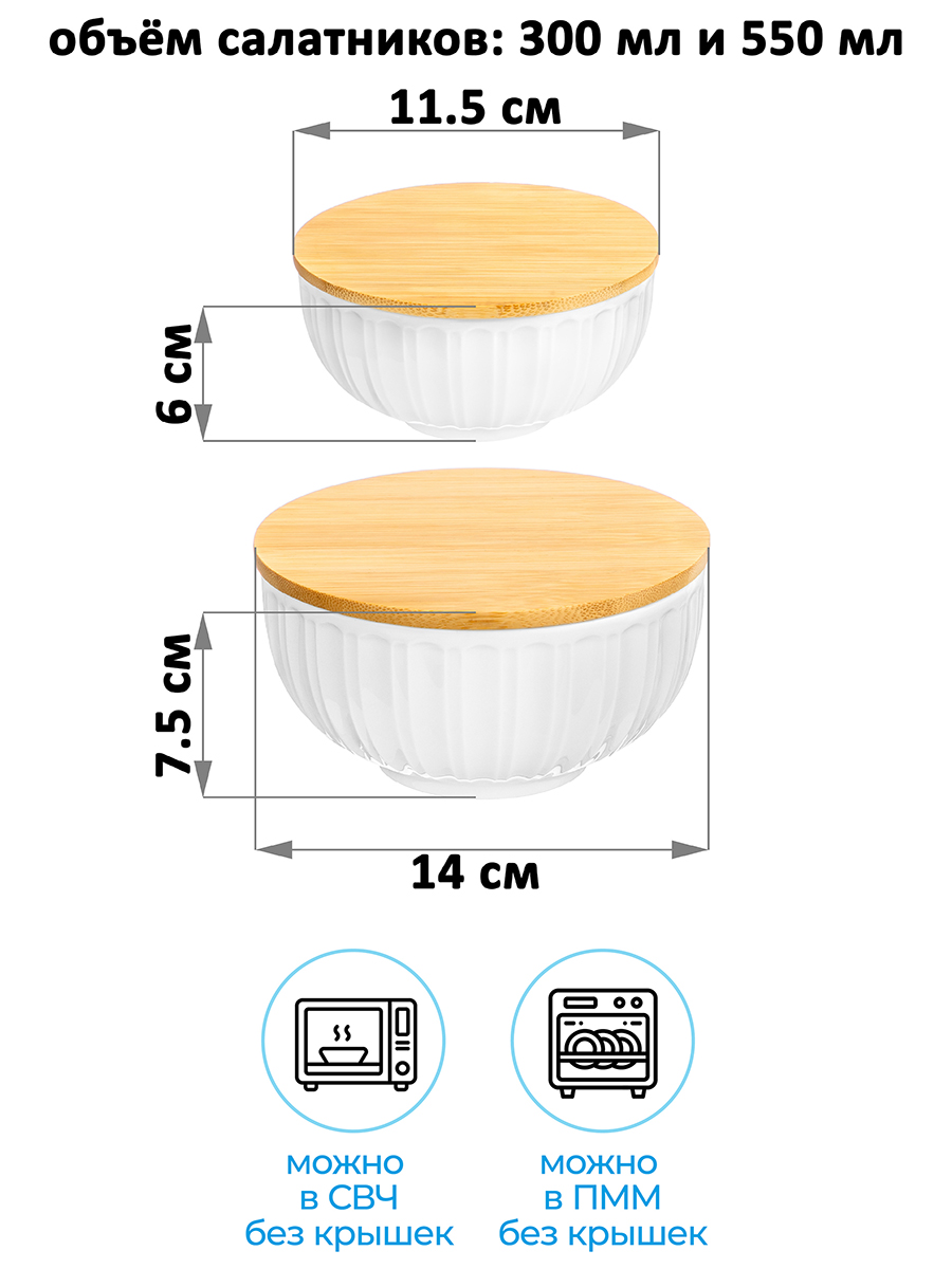 БЫЛО 955 руб! Набор салатников 2 пр. 300 мл 11,5*11,5*6 см + 550 мл 14*14*7,5 "Ампир", с деревян. крышками