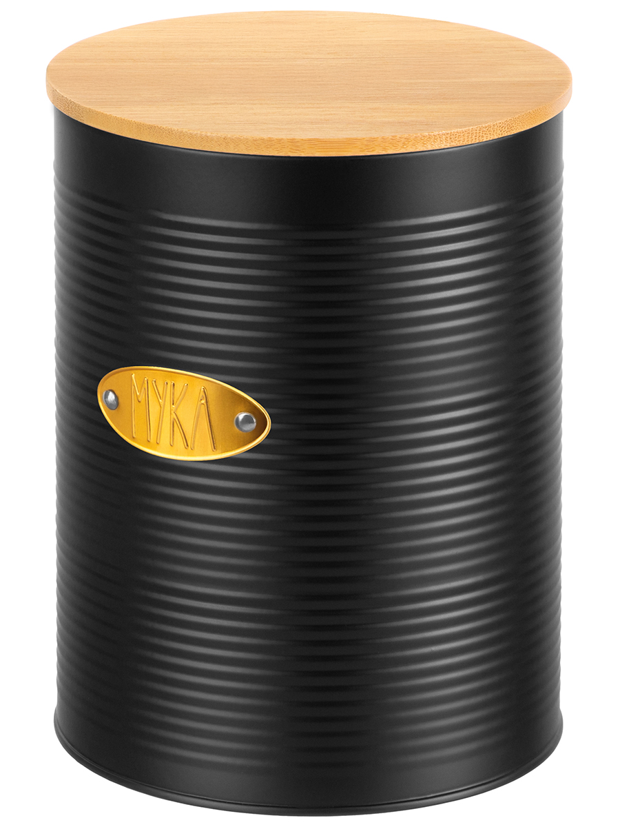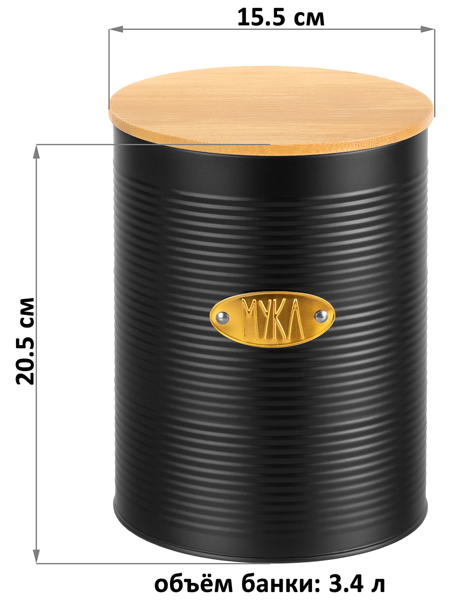 Банка для муки чёрного цвета от Elan Gallery – это стильное решение для хранения сыпучих продуктов! Размер 15,5х15,5х20,5 см, объём 3,4 литра. Высота без крышки 20 см. Выполнена из металла с пудровым покрытием, что обеспечивает долговечность использования. Крышка изготовлена из натурального бамбука и оснащена силиконовым уплотнителем. Контейнер круглой формы украшен золотой табличкой с надписью: "Мука". Поверхность банки имеет ребристый рельеф. Благодаря кухонному органайзеру важнейший ингредиент для создания домашней выпечки будет всегда под рукой! Бамбуковая крышечка с силиконовым уплотнителем защищает продукты от пыли, влаги и других внешних воздействий. Большая металлическая ёмкость с золотистой надписью дополнит вашу коллекцию кухонного инвентаря. Благодаря стильному дизайну баночка станет предметом декора кухни или столовой, украсит интерьер. Не рекомендуется применять абразивные моющие средства. Нельзя использовать в посудомоечной машине и микроволновой печи. Бамбук нельзя замачивать. Станет полезным подарком на любой праздник и всегда пригодится в быту. Поставляется в стильной картонной коробке. Благодаря красочной коробочке не понадобится подарочная упаковка. В коллекции бренда Элан Галерея представлено много товаров для дома и красивой посуды. Баночка позволит эстетично хранить муку на столе или полке, а также поддерживать порядок вашей на кухне!