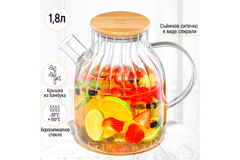 БЫЛО 969 руб! Чайник 1,8 л 20*14*18,5 см "Crystal glass" с ситом+бамб.крышк.с метал. дном/с силик.уплот, стекло