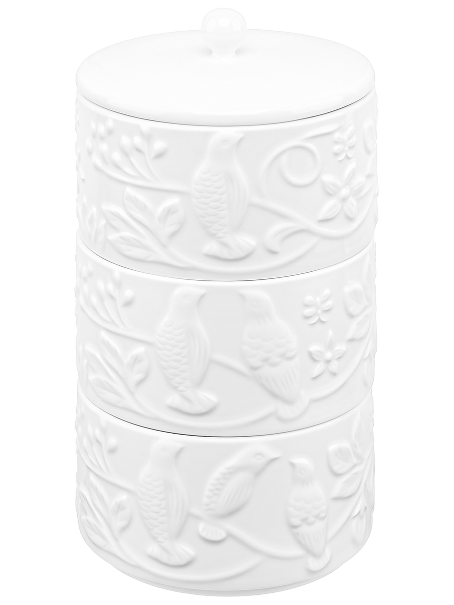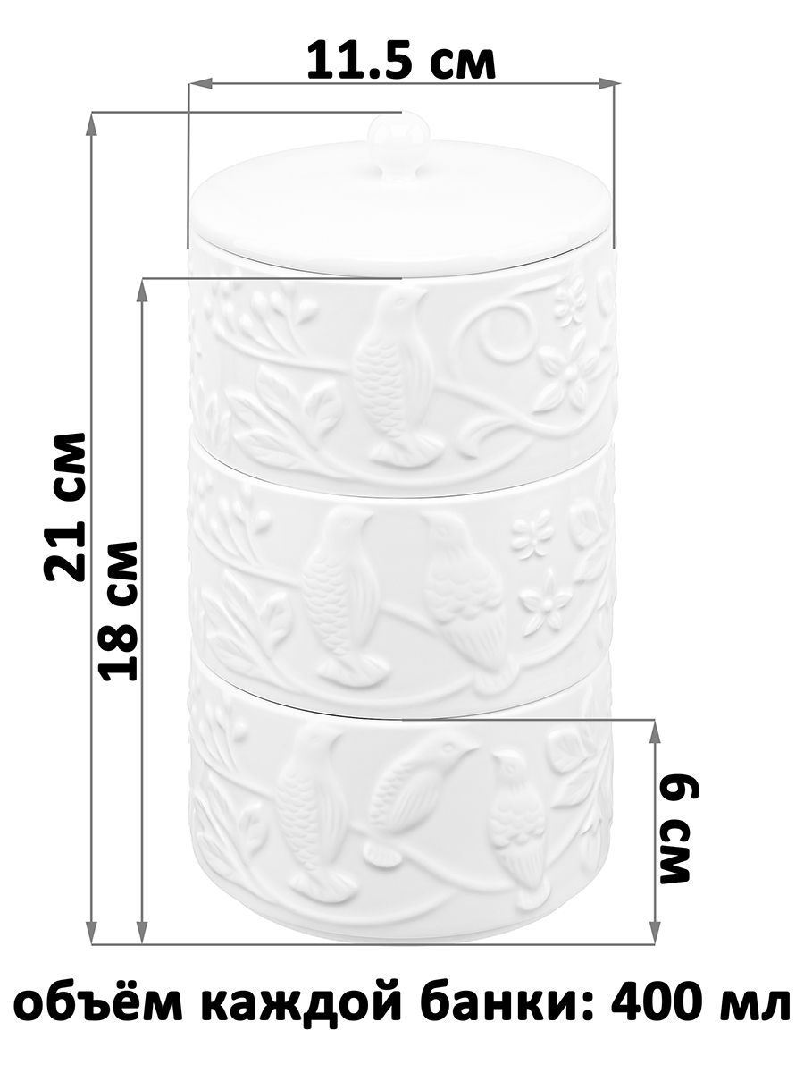 Трёхсекционная банка из серии «Птички на ветке» предназначена для организации хранения сыпучих продуктов. Общий размер изделия – 11,5х11,5х21 см, размер каждой секции – 11х11х6 см, объём – 400 мл. Выполнена из высококачественного белого фарфора. Он не впитывает цвет продуктов и легко отмывается, благодаря чему надолго сохранит свою белизну. Поверхность изделия украшают рельефные узоры в виде лиственных веточек и сидящих на них птичек. Банка состоит из трёх штабелируемых секций, каждая из которых может служить ёмкостью для хранения или сервировки разнообразных продуктов. Заполните её солью и сахаром, специями и приправами, чтобы во время приготовления пищи всё необходимое было под рукой. Насыпьте внутрь чай и кофе, чтобы в любой момент заварить свежий напиток. Подайте баночки с горячими блюдами, чтобы каждый мог приправить пищу по своему вкусу. Дополните чайную сервировку, поместив в каждую мисочку разные сладости: конфеты, печенье, пряники, мармелад или зефир. Используйте для подачи разнообразных закусок: оливок, маслин, ягод, орехов или сухофруктов. Крышечка надёжно прикрывает верхнее отделение и обеспечит сохранность содержимого. Не рекомендуется применять абразивные моющие средства. Подходит для использования в посудомоечной машине и микроволновой печи. Поставляется в дизайнерской картонной коробке – благодаря ей вам не потребуется дополнительная подарочная упаковка. Посуда из серии «Птички на ветке» станет отличным подарком для хозяйки, ценящей не только практичность, но и стиль, и поможет собрать сервиз в едином стиле.