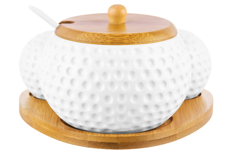 Набор серии "Сфера" состоит из сахарницы на 400 мл с фарфоровой ложкой, солонки и перечницы на деревянной подставке. Набор выполнен из высококачественного фарфора и натурального бамбука. Сахарница и емкости для специй украшены рельефными узорами. Емкости для специй снизу имеют отверстия для наполнения, которые закрываются пластиковыми пробками. Размер набора 15,5х15,5х9,5 см. Фарфоровые детали набора можно мыть в посудомоечной машине. Бамбуковые детали нельзя замачивать. Набор поставляется в яркой картонной упаковке. Набор для специй из серии посуды "Сфера" сможет стать настоящим украшением кухни или приятным подарком для ваших родных и близких!
