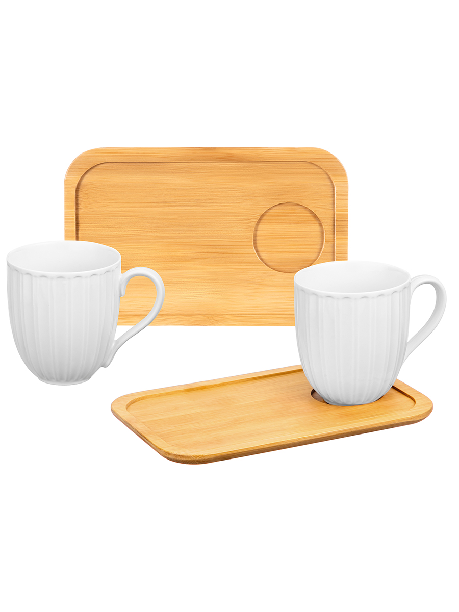 Набор 2 кружек с блюдцами для десертов из серии «Ампир» от Elan Gallery предназначен для эстетичной сервировки стола. Размер каждой ёмкости – 12х8,5х9,5 см, объём – 330 мл. Выполнены из высококачественного белого фарфора. Он не впитывает цвет напитков и легко отмывается, благодаря чему надолго сохраняет свою белизну. Поверхность изделий украшает элегантный ребристый рельеф. Блюдца выполнены из натурального бамбука. Размер каждого – 22х14х1 см. Кофейные кружки помогут вам провести множество приятных завтраков с капучино и латте, а также уютные чайные вечера с конфетами, вафлями, другими десертами и сладостями. Подойдут ценителям чая и кофе, которые любят пить из красивой и необычной посуды. Согрейтесь зимой любимым напитком: какао с маршмэллоу, ягодным чаем или горячим шоколадом. Летом освежитесь домашним лимонадом или морсом. Используйте прямоугольные деревянные блюдца как подставку для чашек благодаря круглым выемкам, и одновременно – как десертные тарелочки для пирожных, кусочков торта и других угощений. Не рекомендуется применять абразивные моющие средства. Без бамбуковых блюдец подходят для использования в посудомоечной машине и микроволновой печи. Бамбук нельзя замачивать! Поставляются в дизайнерской картонной коробке – благодаря ей вам не потребуется дополнительная подарочная упаковка. Фарфоровая сервировочная посуда будет оригинальным подарком для хозяйки, ценящей не только практичность, но и привлекательность. Серия «Ампир» от бренда Элан Галерея станет украшением любого кухонного инвентаря и позволит собрать красивый сервиз в едином стиле!