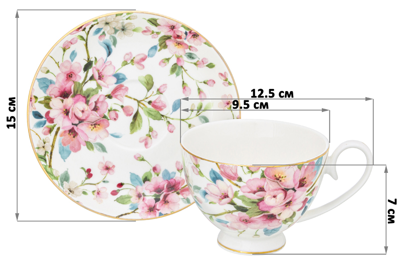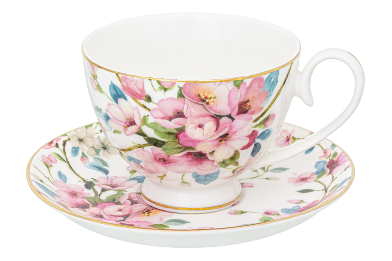 БЫЛО 989 руб! Чайная пара 2 пр. 300 мл 12,5*9,5*7 см "Яблоневый цвет на белом" на ножке, NEW BONE CHINA