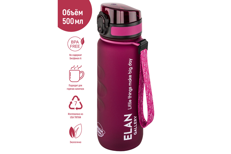 Бутылка для воды «Style Matte» от Elan Gallery – это практичное и стильное решение для ценителей активного образа жизни. Размер ёмкости – 6,5х6,5х23 см. Высота до крышки – 19 см. Объём – 500 мл. Изделие выполнено из тритана – прочного, безопасного материала, не содержащего бисфенол А. Этот пластик не впитывает запахи и не влияет на вкус напитков. Бутылочка подходит как для холодной, так и для горячей жидкости. Освежитесь любимыми летними напитками в жару или согрейтесь ароматным чаем зимой! Матовое покрытие и углубления для пальцев обеспечивают комфортное использование на прогулке, в офисе и на тренировке в зале. Надёжная крышка с герметичным клапаном препятствует проливанию, а встроенное ситечко позволит заваривать напитки с травами и фруктами. С удобным ремешком бутылку можно закрепить на рюкзаке или запястье – это позволяет брать её в путешествия, поездку на велосипеде или автомобиле. Многоразовая дорожная бутылка подходит как для туризма, так и для пикника на природе. Удобная форма делает её не только туристическим, но и спортивным инвентарём. Пластиковая ёмкость для питья – прекрасный вариант для занятий фитнесом, йогой или бегом в спортзале или на свежем воздухе. Она также дополнит занятия велоспортом в качестве велосипедного аксессуара. Это надёжный помощник спортсменам во время игры в футбол или волейбол, занятий гимнастикой и танцами. Подходит как для взрослых, так и для школьников – её можно взять в школу и на занятия физкультурой. Благодаря универсальному дизайну и цвету бургундия она подойдёт как девочкам, так и мальчикам в качестве школьного аксессуара. Функциональная бутылка в дизайнерской картонной упаковке – это готовый подарок для женщин и мужчин. Не подходит для микроволновой печи, посудомоечной машины и стерилизатора. В коллекции бренда Элан Галерея представлена разнообразная посуда и товары для дома на любой вкус. Спортивные аксессуары из серии «Style Matte» помогут следить за водным балансом, где бы вы ни находились!