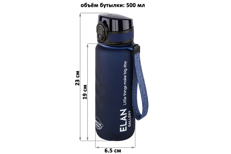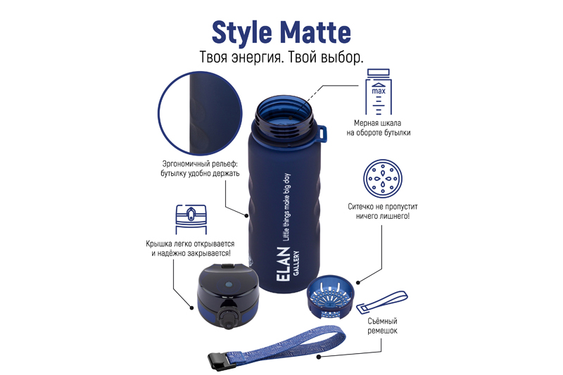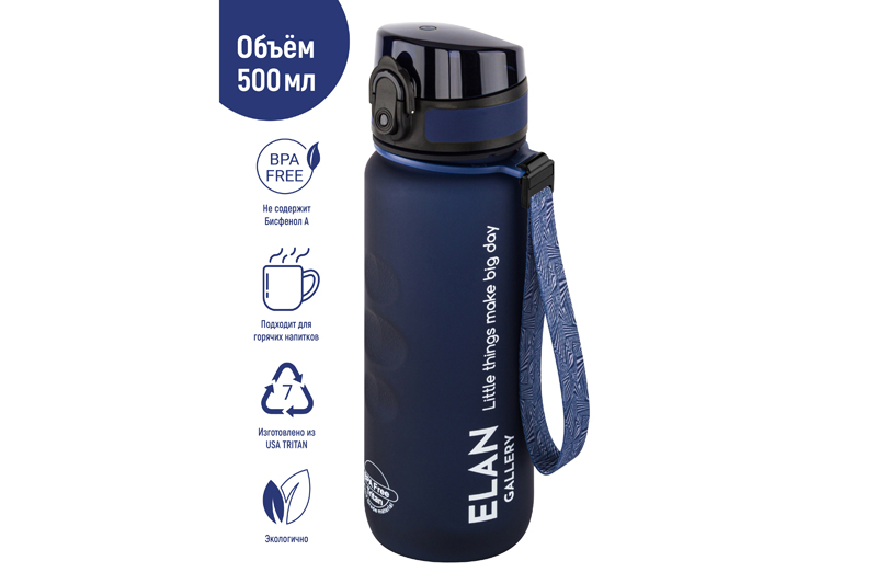 Бутылка для воды «Style Matte» от Elan Gallery – это практичное и стильное решение для ценителей активного образа жизни. Размер ёмкости – 6,5х6,5х23 см. Высота до крышки – 19 см. Объём – 500 мл. Изделие выполнено из тритана – прочного, безопасного материала, не содержащего бисфенол А. Этот пластик не впитывает запахи и не влияет на вкус напитков. Бутылочка подходит как для холодной, так и для горячей жидкости. Освежитесь любимыми летними напитками в жару или согрейтесь ароматным чаем зимой! Матовое покрытие и углубления для пальцев обеспечивают комфортное использование на прогулке, в офисе и на тренировке в зале. Надёжная крышка с герметичным клапаном препятствует проливанию, а встроенное ситечко позволит заваривать напитки с травами и фруктами. С удобным ремешком бутылку можно закрепить на рюкзаке или запястье – это позволяет брать её в путешествия, поездку на велосипеде или автомобиле. Многоразовая дорожная бутылка подходит как для туризма, так и для пикника на природе. Удобная форма делает её не только туристическим, но и спортивным инвентарём. Пластиковая ёмкость для питья – прекрасный вариант для занятий фитнесом, йогой или бегом в спортзале или на свежем воздухе. Она также дополнит занятия велоспортом в качестве велосипедного аксессуара. Это надёжный помощник спортсменам во время игры в футбол или волейбол, занятий гимнастикой и танцами. Подходит как для взрослых, так и для школьников – её можно взять в школу и на занятия физкультурой. Благодаря универсальному дизайну и тёмно-синему цвету она подойдёт как девочкам, так и мальчикам в качестве школьного аксессуара. Функциональная бутылка в дизайнерской картонной упаковке – это готовый подарок для женщин и мужчин. Не подходит для микроволновой печи, посудомоечной машины и стерилизатора. В коллекции бренда Элан Галерея представлена разнообразная посуда и товары для дома на любой вкус. Спортивные аксессуары из серии «Style Matte» помогут следить за водным балансом, где бы вы ни находились!