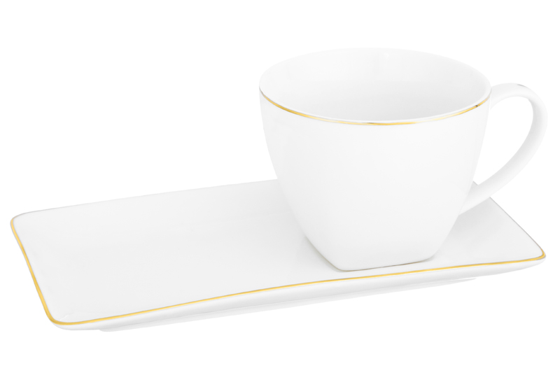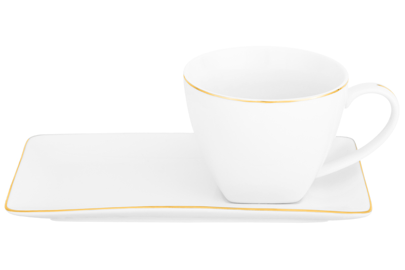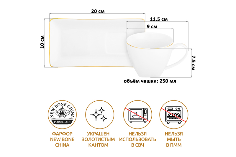 Чайная пара из серии «Белая с золотом» предназначена для красивой сервировки стола. Размер ёмкости – 11,5х9х7,5 см, объём – 250 мл. Размер блюдца – 20х10х2 см. Выполнены из фарфора нового поколения new bone china, сочетающего в себе изящность и высокую прочность. За счёт гладкости изделия легко отмываются, поэтому сохраняют привлекательный вид и практичны в использовании. Плотная структура материала позволяет посуде дольше сохранять температуру блюд и напитков. От других видов костяного фарфора new bone china отличается большей экологичностью в производстве. Белая фарфоровая посуда с элегантным золотистым кантом станет изящным дополнением интерьера любой кухни, столовой и гостиной. Кофейная кружка поможет провести множество приятных завтраков с капучино или латте, а также уютные чайные вечера с конфетами, вафлями, другими десертами и сладостями. Подойдёт ценителям чая и кофе, которые любят пить из красивой и необычной посуды. Согрейтесь зимой любимым горячим напитком: какао с маршмэллоу, ягодным чаем, горячим шоколадом. Летом освежитесь домашним лимонадом или морсом. Используйте необычное сервировочное блюдце прямоугольной формы как подставку для чашки, чтобы порадовать гостей изящной сервировкой. Положите на десертную тарелку пирожное, кусочек торта или домашнего пирога. Подойдёт не только для десертов, но и для закусок: сырной нарезки, сырокопчёной колбасы или свежих овощей и зелени. Декоративные изделия добавят эстетики любому чаепитию. Не рекомендуется применять абразивные моющие средства. Не подходит для использования в микроволновой печи и посудомоечной машине. Поставляется в картонной коробке. Фарфоровая сервировочная посуда послужит оригинальным подарком для хозяйки, ценящей не только практичность, но и привлекательность. Серия «Белая с золотом» станет украшением любого кухонного инвентаря и позволит собрать сервиз в едином стиле!
