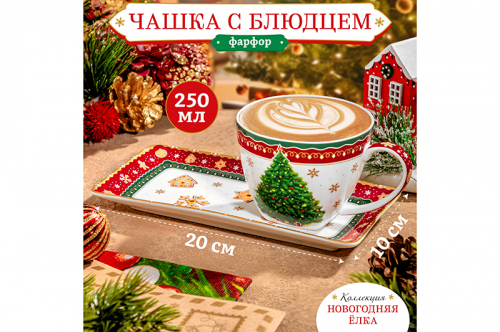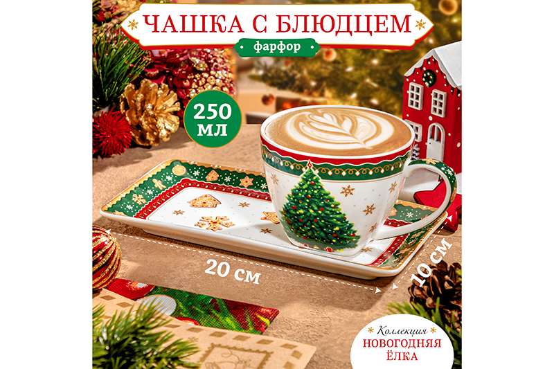 Чашка 250 мл с блюдцем для десерта 20*10*2 см "Новогодняя елка" зелёный узор NEW BONE CHINA