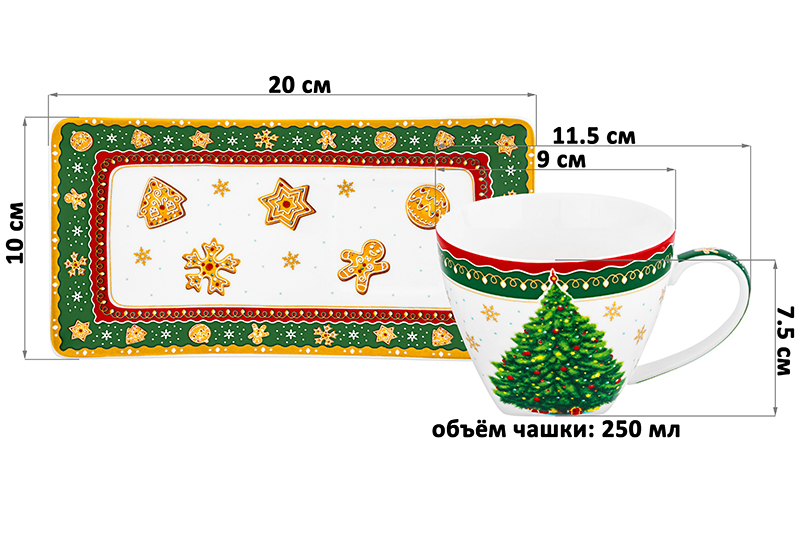 Чашка 250 мл с блюдцем для десерта 20*10*2 см "Новогодняя елка" зелёный узор NEW BONE CHINA