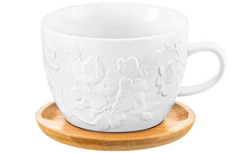 Чашка для капучино и кофе латте Elan Gallery "Цветущая сакура" объёмом 500 мл выполнена из белого фарфора с рельефным узором. Имеет подставку из бамбука 12,8х12,8х1 см, можно использовать в роли крышки. Общий размер комплекта – 15х12,8х8,5 см. Большой бокал подходит ценителям кофе, которые любят пить из красивой и необычной посуды. Это идеальный вариант для того, чтобы согреться горячим напитком зимой и освежиться прохладным лимонадом летом. Подойдёт для любых напитков, например, чая. Благодаря большому объёму станет незаменимым предметом на долгом чаепитии или чайной церемонии! Широкая кружечка с бамбуковым блюдцем украсит ваш стол своим стильным дизайном как на праздник, так и в будни. Можно использовать в роли чайной пары. Не рекомендуется применять абразивные моющие средства. Без бамбуковой тарелочки (подставки) можно греть в микроволновой печи и мыть в посудомоечной машине. Бамбук нельзя замачивать! Поставляется в картонной коробке. Станет приятным подарком на любой праздник. Благодаря стильной картонной коробочке вам не понадобится дополнительная подарочная упаковка! Серия фарфоровой посуды "Цветущая сакура" позволит собрать сервиз в едином стиле. В коллекции бренда Elan Gallery представлено красивых товаров для дома. Вы обязательно найдёте что-то на свой вкус!
