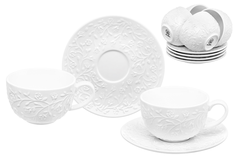 Набор 6 чайных пар из серии «Веточки-цветочки» от Elan Gallery предназначен для эстетичной сервировки вашего стола. Размер каждой ёмкости – 13х10х6,5 см, объём – 300 мл. Размер каждого блюдца – 16х16х1,8 см. Выполнены из высококачественного белого фарфора. Он не впитывает цвет напитков и легко отмывается, благодаря чему надолго сохраняет свою белизну. Поверхность изделий украшают рельефные узоры в виде лиственных веточек с аккуратными цветочными бутончиками. Кофейные кружки помогут вам провести множество приятных завтраков с капучино и латте, а также уютные чайные вечера с конфетами, вафлями, другими десертами и сладостями. Подойдут ценителям чая и кофе, которые любят пить из красивой и необычной посуды. Согрейтесь зимой любимым горячим напитком: какао с маршмэллоу, ягодным чаем или горячим шоколадом. Летом освежитесь домашним лимонадом или морсом. Используйте сервировочные блюдца как подставки для чашек, чтобы порадовать гостей изящной сервировкой. Положите на десертные тарелки пирожные, кусочки торта или домашнего пирога. Подойдут не только для десертов, но и для закусок: сырной нарезки, сырокопчёной колбасы или свежих овощей и зелени. Декоративные изделия позволят организовать запоминающееся чаепитие в большой компании. Не рекомендуется применять абразивные моющие средства. Подходят для использования в микроволновой печи и посудомоечной машине. Поставляются в дизайнерской картонной коробке – благодаря ей вам не потребуется дополнительная подарочная упаковка. Фарфоровая сервировочная посуда будет оригинальным подарком для хозяйки, ценящей не только практичность, но и привлекательность. Серия «Веточки-цветочки» от бренда Элан Галерея станет украшением любого кухонного инвентаря и позволит собрать красивый сервиз в едином стиле!