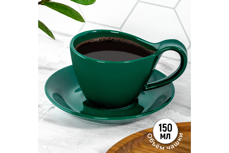 Кофейная пара серии "Колоранс" насыщенного зелёного цвета состоит из 2-х предметов: чашка на 150 мл и блюдце диаметром 14 см. Размер кружечки 12,5х8х6,5 см. Используйте набор как чайный или кофейный. Чашка на подставке поможет провести множество вкусных завтраков с капучино или латте, а также уютных вечеров с любым горячим напитком. Набор выполнен из фарфора, обладает необычной геометрией и насыщенным цветом. Кружка серии "Колоранс" - это фактурная посуда в современном исполнении. Удобно для сервировки американо или эспрессо. Фарфоровая посуда отличается от керамики повышенной плотностью и термостойкими свойствами. Фарфор не впитывает цвет кофе или чая и не деформируется от влаги, чему может быть подвержена керамическая посуда. Кружку и тарелку можно использовать в СВЧ (микроволновой печи) и ПММ (посудомоечной машине). Поставляются в стильной картонной упаковке. Красивая кофейная пара из серии посуды "Колоранс" станет настоящим украшением вашей сервировки или приятным подарком для родных и близких! /