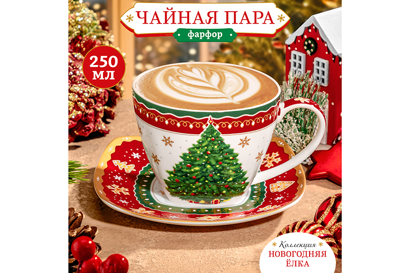 Чайная пара из серии «Новогодняя ёлка» от Elan Gallery предназначена для эстетичной сервировки вашего стола. Размер ёмкости – 11,5х9х7,5 см, объём – 250 мл. Размер блюдца – 14х14х1 см. Выполнена из фарфора нового поколения new bone china, сочетающего в себе изящность и высокую прочность. Такие изделия легко отмываются, поэтому сохраняют привлекательный вид и практичны в использовании. Плотная структура материала позволяет посуде дольше сохранять температуру блюд и напитков. От других видов костяного фарфора new bone china отличается большей экологичностью в производстве. Поверхность украшена широкой цветной окантовкой, изображением пушистой наряженной ёлочки, узором из снежинок и имбирных пряников. Кофейная кружка поможет вам провести множество приятных завтраков с капучино и латте, а также уютные чайные вечера. Подойдёт ценителям чая и кофе, которые любят пить из красивой и необычной посуды. Согрейтесь зимой любимым напитком: какао с маршмэллоу, ягодным чаем, горячим шоколадом или глинтвейном. Используйте сервировочное блюдце как подставку для чашки, порадовав гостей изящной сервировкой. Положите на десертную тарелку пирожное, кусочек торта или домашнего пирога. Не рекомендуется применять абразивные моющие средства. Подходят для использования в посудомоечной машине и микроволновой печи. Поставляются в дизайнерской картонной коробке – благодаря ей вам не потребуется дополнительная подарочная упаковка. Фарфоровая коллекция посуды «Новогодняя ёлка» от бренда Элан Галерея создаст в доме атмосферу волшебства и подарит праздничное настроение. В серии вы найдёте всё необходимое, чтобы встретить праздник в тёплом семейном кругу. Она станет приятным подарком вашим близким на Новый год и будет долго напоминать о вашей дружбе! /