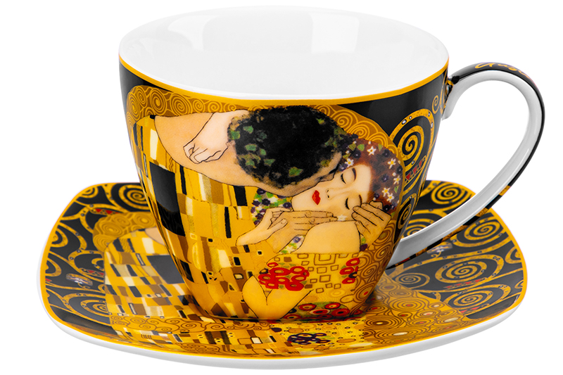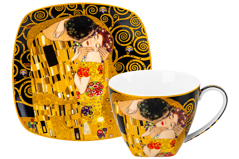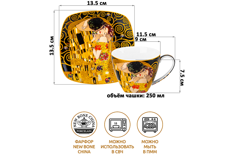 Чайная пара Elan Gallery "Поцелуй на чёрном" выполнена из фарфора нового поколения new bone china, украшена изображением в стиле модерн. New bone china сочетает в себе изящность и высокую прочность. От других видов костяного фарфора материал отличается большей экологичностью в производстве. Объём чашки – 250 мл, размер блюдца – 11,5х9х7,5 см. Чашка и десертное блюдечко украшены роскошными репродукциями картины художника Густава Климта. В коллекции бренда Elan Gallery можно найти много красивой посуды и предметов декора с изображениями по мотивам шедевров мировой живописи! Блюдечко имеет оригинальную квадратную форму. Кружка подходит ценителям чая и кофе, которые любят пить из красивой и необычной посуды. Посуда украсит ваш стол своим стильным дизайном как на праздник, так и в будни. Это идеальный вариант для того, чтобы согреться горячим чаем зимой и освежиться прохладным лимонадом летом. Используйте блюдце как подставку для кружечки, чтобы порадовать гостей изящной сервировкой. Положите на тарелку кусочек торта, домашнего пирога или пирожное. Она подойдёт не только для десерта, но и закусок: сырной нарезки, сырокопчёной колбасы или свежих овощей и зелени. Не рекомендуется применять абразивные моющие средства. Набор можно использовать в микроволновой печи и посудомоечной машине. Поставляется в красивой картонной коробке. Станет приятным подарком вашим близким на любой праздник. Благодаря стильной коробочке не понадобится подарочная упаковка. Чашка с десертной тарелочкой станут украшением вашей кухни или приятным сюрпризом для ценителей искусства!