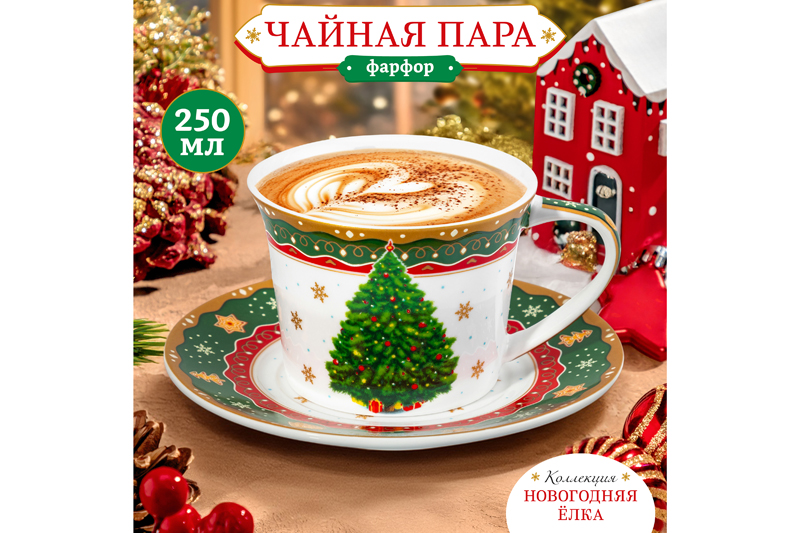 Чайн. пара 2 пр. 250 мл 12,5*9,5*7 см "Новогодняя елка" зеленый узор, NEW BONE CHINA