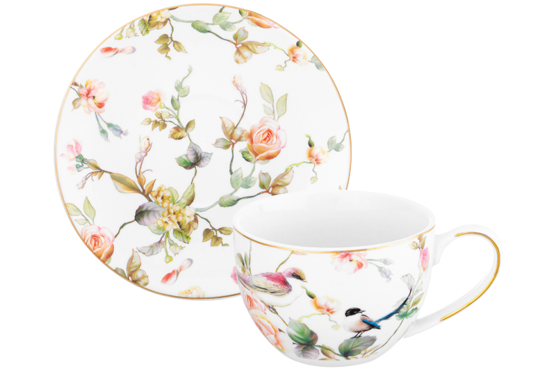 Чайная пара из серии "Певчие птички" от Elan Gallery предназначена для эстетичной сервировки вашего стола. Размер чашки – 12,5х9х6,5 см, объём – 250 мл. Размер блюдца – 15,3х15,3х2 см. Изделия выполнены из фарфора нового поколения new bone china, сочетающего в себе изящность и высокую прочность. За счёт гладкости они легко отмываются, поэтому сохраняют привлекательный внешний вид и практичны в использовании. Плотная структура материала позволяет посуде дольше сохранять температуру блюд и напитков. От костяного фарфора new bone china отличается большей экологичностью в производстве. Посуда с изображениями птичек и розовых цветов украшена золотистым кантом. Кофейная кружечка поможет провести множество приятных завтраков с капучино и латте, а также уютные чайные вечера с конфетами, вафлями, другими десертами и сладостями. Подойдёт ценителям чая и кофе, которые любят пить из красивой и необычной посуды. Согрейтесь зимой любимым напитком: какао с маршмеллоу, ягодным чаем или горячим шоколадом. Летом освежитесь домашним лимонадом или морсом. Используйте сервировочное блюдце как подставку для чашки или положите пирожное, кусочек торта или домашнего пирога. Подойдёт для закусок: сырной нарезки, сырокопчёной колбасы или свежих овощей и зелени. Не рекомендуется применять абразивные моющие средства. Нельзя использовать в посудомоечной машине и микроволновой печи. Поставляется в стильной картонной коробке. Благодаря красочной коробочке не потребуется дополнительная подарочная упаковка, если вы решите преподнести сюрприз своим близким. Фарфоровая сервировочная посуда станет приятным подарком на любой праздник для тех, кто ценит сочетание практичности и привлекательности. В коллекции бренда Элан Галерея вы найдёте много стильных товаров для дома, кухонного инвентаря и всё для эстетичного чаепития. Выберите варианты на свой вкус! /