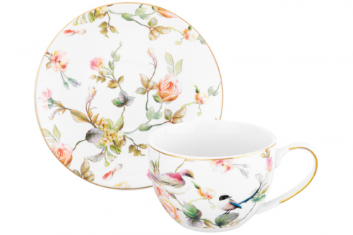 Набор 2 чайных пар из серии "Певчие птички" от Elan Gallery предназначен для эстетичной сервировки вашего стола. В комплект входят 2 чашечки и 2 десертные тарелки. Размер каждой чашки – 12,5х9х6,5 см, объём – 250 мл. Размер каждого блюдца – 15,3х15,3х2 см. Изделия выполнены из фарфора нового поколения new bone china, сочетающего в себе изящность и высокую прочность. За счёт гладкости они легко отмываются, поэтому сохраняют привлекательный внешний вид и практичны в использовании. Плотная структура материала позволяет посуде дольше сохранять температуру блюд и напитков. От костяного фарфора new bone china отличается большей экологичностью в производстве. Посуда с изображениями птичек и розовых цветов украшена золотистым кантом. Кофейная кружечка поможет провести множество приятных завтраков с капучино и латте, а также уютные чайные вечера с конфетами, вафлями, другими десертами и сладостями. Подойдёт ценителям чая и кофе, которые любят пить из красивой и необычной посуды. Согрейтесь зимой любимым напитком: какао с маршмеллоу, ягодным чаем или горячим шоколадом. Летом освежитесь домашним лимонадом или морсом. Используйте сервировочное блюдце как подставку для кружки или положите пирожное, кусочек торта или домашнего пирога. Подойдёт для закусок: сырной нарезки, сырокопчёной колбасы или свежих овощей и зелени. Не рекомендуется применять абразивные моющие средства. Нельзя использовать в посудомоечной машине и микроволновой печи. Набор на 2 персоны поставляется в стильной картонной коробке. Благодаря красочной коробочке не потребуется дополнительная подарочная упаковка, если вы решите преподнести сюрприз своим близким. Фарфоровая сервировочная посуда станет приятным подарком на любой праздник для тех, кто ценит сочетание практичности и привлекательности. В коллекции бренда Элан Галерея вы найдёте много стильных товаров для дома, кухонного инвентаря и всё для эстетичного чаепития. Выберите варианты на свой вкус! /