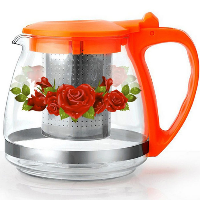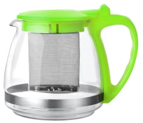1,0л. Ручка и крышка пластиковая цветная. Ситечко из нерж.стали. Автоматическое открывание крышки. Подходит для чистки в посудомоечной машине. Состав: жаропрочное стекло.