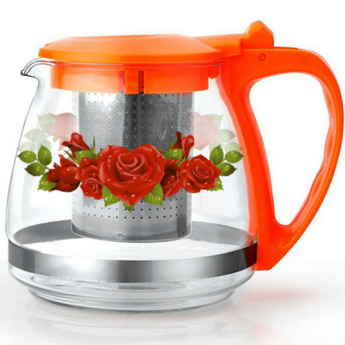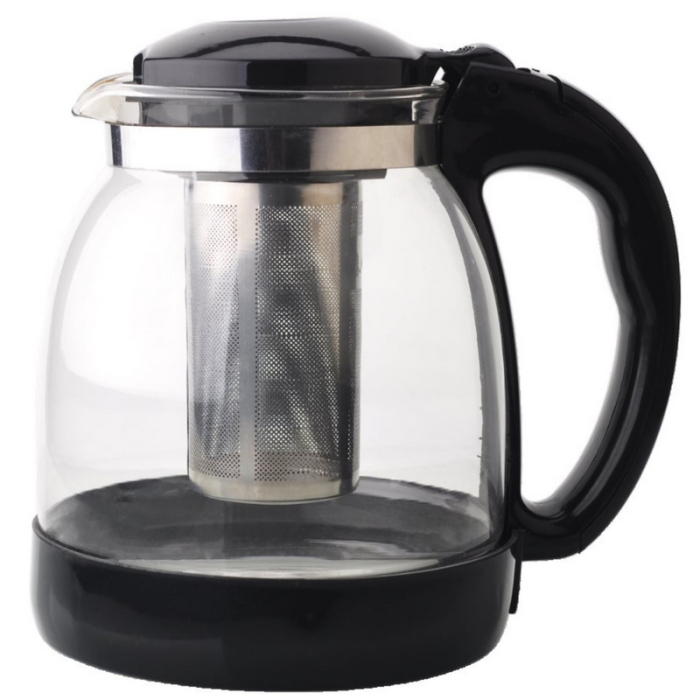 1,8л. Ручка и крышка пластиковая. Ситечко из нерж.стали. Автоматическое открывание крышки.Подходит для чистки в посудомоечной машине. Состав: жаропрочное стекло.