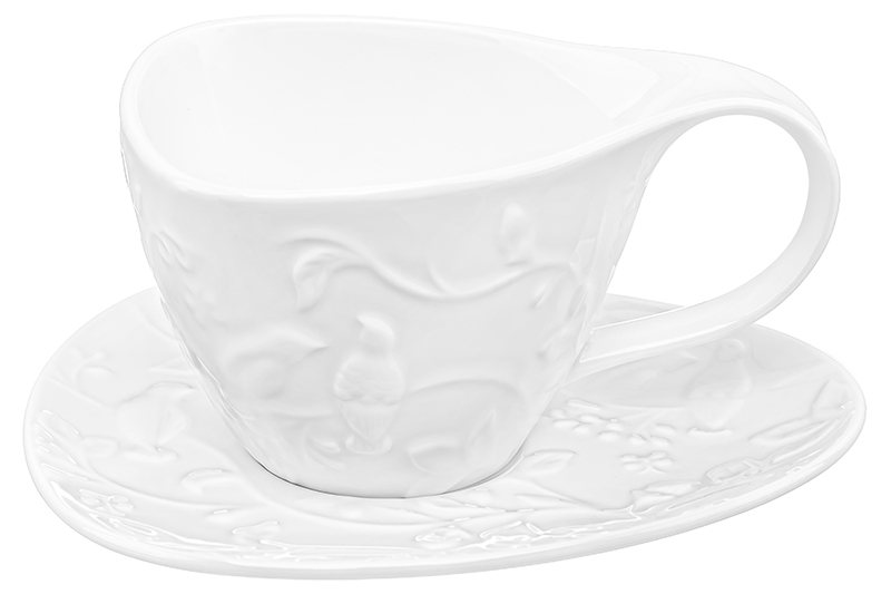 Чайная пара из серии «Птички на ветке» от Elan Gallery предназначена для эстетичной сервировки вашего стола. Размер ёмкости – 14,3х10,3х7,8 см, объём – 300 мл. Размер блюдца – 17,2х15,4х2,2 см. Выполнены из высококачественного белого фарфора. Он не впитывает цвет напитков и продуктов и легко отмывается, благодаря чему надолго сохранит свою белизну. Поверхность изделий украшают рельефные узоры в виде лиственных веточек и сидящих на них птичек. Имеют необычную геометрическую форму, а благодаря «впалой» поверхности ручки кофейную кружку приятно держать и удобно переносить. Набор поможет провести множество приятных завтраков с капучино и латте, а также уютные чайные вечера с конфетами, вафлями, другими десертами и сладостями. Подойдёт ценителям чая и кофе, которые любят пить из красивой и необычной посуды. Согрейтесь зимой любимым горячим напитком: какао с маршмэллоу, ягодным чаем, горячим шоколадом. Летом освежитесь домашним лимонадом или морсом. Используйте сервировочное блюдце как подставку для чашки, чтобы порадовать гостей изящной сервировкой. Положите на десертную тарелку пирожное, кусочек торта или домашнего пирога. Подойдёт не только для десертов, но и для закусок: сырной нарезки, сырокопчёной колбасы или свежих овощей и зелени. Декоративные изделия добавят эстетики любому чаепитию. Не рекомендуется применять абразивные моющие средства. Подходят для использования в микроволновой печи и посудомоечной машине. Поставляются в дизайнерской картонной коробке – благодаря ей вам не потребуется дополнительная подарочная упаковка. Фарфоровая сервировочная посуда послужит оригинальным подарком для хозяйки, ценящей не только практичность, но и привлекательность. Серия «Птички на ветке» от бренда Элан Галерея станет украшением любого кухонного инвентаря и позволит собрать сервиз в едином стиле!
