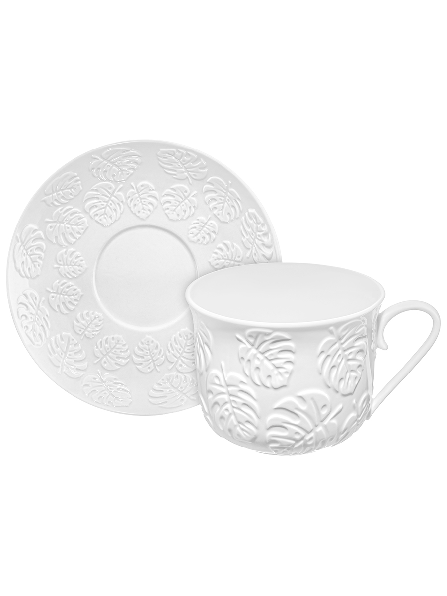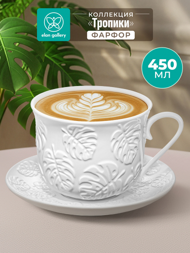 Чайная пара из серии «Тропики» от Elan Gallery предназначена для эстетичной сервировки вашего стола. Размер ёмкости – 14х11х8,5 см, объём – 450 мл. Размер блюдца – 16х16х2 см. Выполнена из высококачественного белого фарфора. Он не впитывает цвет напитков и легко отмывается, благодаря чему надолго сохраняет свою белизну. Поверхность украшена рельефным узором в виде тропических листьев. Кофейная кружка поможет вам провести множество приятных завтраков с капучино и латте, а также уютные чайные вечера с конфетами, вафлями, другими десертами и сладостями. Подойдёт ценителям чая и кофе, которые любят пить из красивой и необычной посуды. Согрейтесь зимой любимым напитком: какао с маршмэллоу, ягодным чаем, горячим шоколадом. Летом освежитесь лимонадом или морсом. Используйте сервировочное блюдце как подставку для чашки, порадовав гостей изящной сервировкой. Положите на десертную тарелку пирожные, кусочки торта или домашнего пирога. Подойдёт не только для десертов, но и для закусок: сырной нарезки, сырокопчёной колбасы или свежих овощей и зелени. Не рекомендуется применять абразивные моющие средства. Подходит для использования в посудомоечной машине и микроволновой печи. Поставляется в дизайнерской картонной коробке – благодаря ей вам не потребуется дополнительная подарочная упаковка. Фарфоровая сервировочная посуда будет оригинальным подарком для хозяйки, ценящей не только практичность, но и привлекательность. Серия «Тропики» от бренда Элан Галерея станет украшением любого кухонного инвентаря и позволит собрать красивый сервиз в едином стиле!