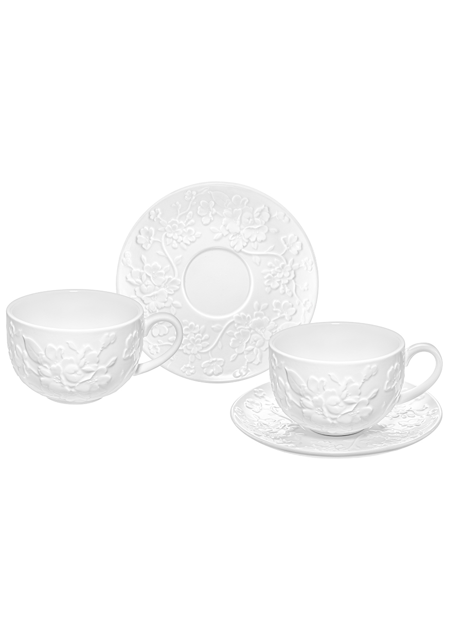 Набор 2 чайных пар Elan Gallery "Цветущая сакура" выполнен из белого фарфора и украшен рельефным узором с цветами. Объём каждой чашки – 300 мл, размер – 13х10х6,5 см. Размер каждого блюдца – 16х16х2 см. Чашки с блюдцами для десерта украсят ваш стол своим эстетичным дизайном как на праздник, так и в будни. Используйте блюдце как подставку для чашки, чтобы порадовать гостей изящной сервировкой. Положите на десертную тарелку кусочек торта, домашнего пирога или пирожное. Небольшая тарелочка подойдёт не только для десерта, но и закусок: сырной нарезки, сырокопчёной колбасы или свежих овощей и зелени. В отличие от керамики фарфор не впитывает цвет напитков, легко отмывается, поэтому сохраняет свою белизну долгое время. Беречь от резких перепадов температур и механических повреждений. Не рекомендуется применять абразивные моющие средства. Комплект можно использовать в микроволновой печи и посудомоечной машине. Поставляется в красивой картонной коробке, поэтому вам не понадобится дополнительная подарочная упаковка, если вы решите преподнести сюрприз. Изящный набор на 2 персоны станет приятным подарком на любой праздник и добавит эстетики каждому чаепитию. В коллекции бренда Элан Галерея представлено много стильных товаров для дома, в том числе всё для создания красоты и уюта на кухне. Коллекция "Цветущая сакура" от Elan Gallery придаст элегантности повседневной сервировке и станет украшением праздничного стола!