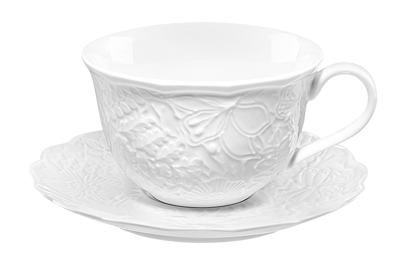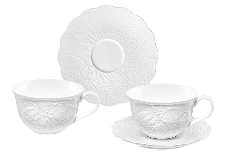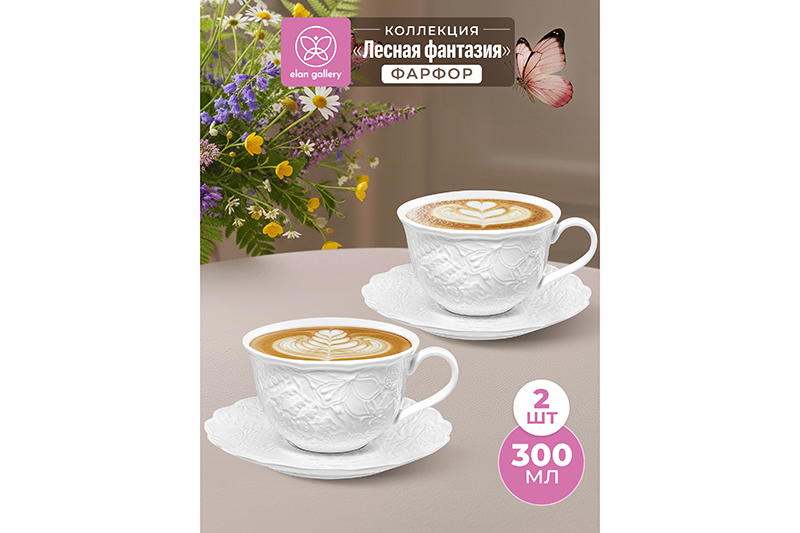 Набор 2 чайных пар Elan Gallery "Лесная фантазия" выполнен из белого фарфора. Объём каждой чашки – 300 мл, размер – 13,5х11х7 см. Размер каждого блюдца – 17х17х12 см. Коллекция посуды "Лесная фантазия" украшена изящным рельефным узором в виде цветов и порхающих бабочек. Она навевает фантазии о лесной поляне — благоухающей и согретой лучами солнца. Кружки с рельефом подходят ценителям чая и кофе, которые любят пить из красивой посуды. Это идеальный вариант для того, чтобы согреться горячим глинтвейном зимой и освежиться прохладным лимонадом летом. Чашки с блюдцами для десерта украсят ваш стол своим эстетичным дизайном как на праздник, так и в будни. Используйте блюдце как подставку для чашки, чтобы порадовать гостей изящной сервировкой. Положите на десертную тарелку кусочек торта, домашнего пирога или пирожное. Небольшая тарелочка подойдёт не только для десерта, но и закусок: сырной нарезки, сырокопчёной колбасы или свежих овощей и зелени. В отличие от керамики фарфор не впитывает цвет напитков, легко отмывается, поэтому сохраняет свою белизну долгое время. Не рекомендуется применять абразивные моющие средства. Беречь от резких перепадов температур и механических повреждений. Комплект можно использовать в микроволновой печи и посудомоечной машине. Поставляется в красивой картонной коробке, поэтому вам не понадобится дополнительная подарочная упаковка, если вы решите преподнести сюрприз. Изящный набор на 2 персоны станет приятным подарком на любой праздник и добавит эстетики каждому чаепитию. В коллекции бренда Элан Галерея представлено много стильных товаров для дома, в том числе всё для создания красоты и уюта на кухне. Коллекция "Лесная фантазия" от Elan Gallery наполнит повседневные моменты лёгкостью и сказочной атмосферой, а также позволит создать красивую сервировку праздничного стола!