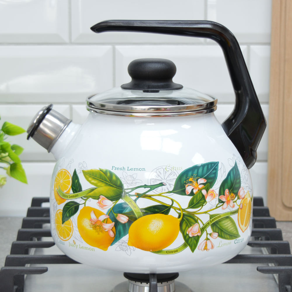 Чайник 3л со свистком "Лимоны в цвету"Чайник изготовлен из эмалированной стали, которая не впитывает запахи, не окисляется.Носик чайника оснащен насадкой-свистком, который позволяет контролировать процесс кипячения или подогрева воды.Подходит для всех типов плит, в том числе индукционных.Объем - 3 л.Размер - 23х17х23 см.Заключаем договора по 44 ФЗ, 223 ФЗ
