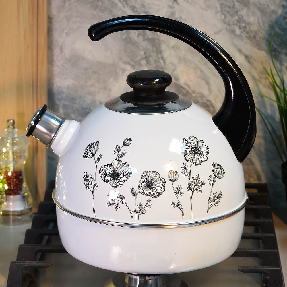 Чайник 4л со свистком, консольная ручка, белый "Черная космея"