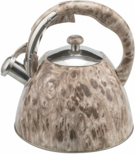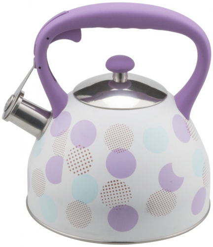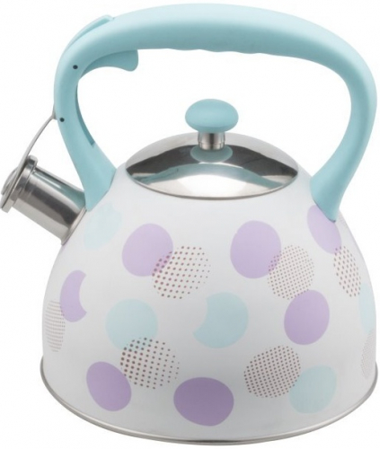 Чайник 3л. со свистком. Толщина стенки 04мм, толщина дна 2,5мм. Корпус белого цвета с цветным узором. Ручка с цветным нейлоновым покрытием. Крышка из нержавеющей стали с цветной нейлоновой ручкой. Капсулированное дно. Подходит для индукционной плиты и чистки в посудомоечной машине. Состав: нержавеющая сталь.